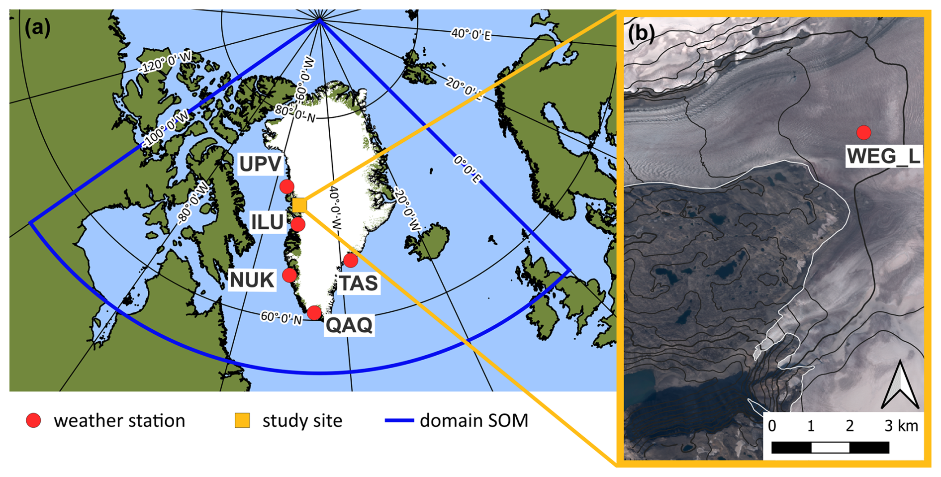 Figure 1(a) Overview map of Greenland with the locations of the weather stations from DMI (red dots) and the study site (yellow square). The blue frame shows the domain used for the SOM analysis. (b) Detailed map of the study site Qaamarujup Sermia with the location of the weather station WEG_L. Created based on QGreenland v1.0.1. (Moon et al., 2021).