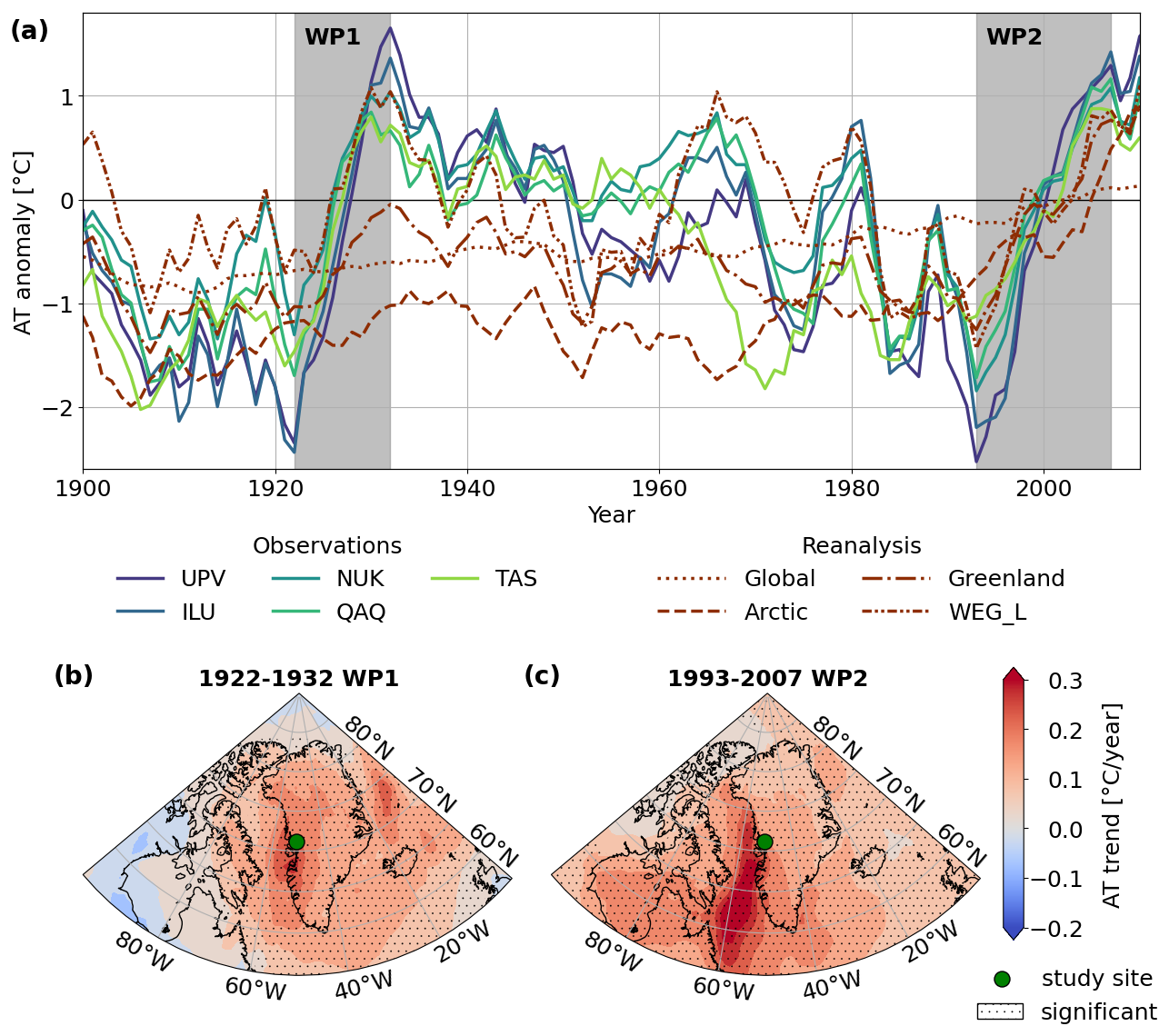 The course of the AT anomaly between 1900 and 2015 relative to the reference period (1986–2015) at the stations UPV, ILU, NUK, QAQ and TAS, the 20CRv3 area average for the globe, the Arctic, Greenland as well as 20CRv3 interpolated to WEG_L shows two distinguished WPs (Fig. 2a). These two periods are observed at all stations and show a continuous increase over more than 5 years. Based on this, we determine WP1 between 1922 and 1932, and WP2 between 1993 and 2007. During WP1, the AT anomaly increased on average by 2.9 °C across stations, while in WP2, it increased by 3.1 °C, though WP2 spans a longer period (14 years compared to 10 years for WP1). The average annual increase for both WPs across all stations is 0.2 °C yr−1.