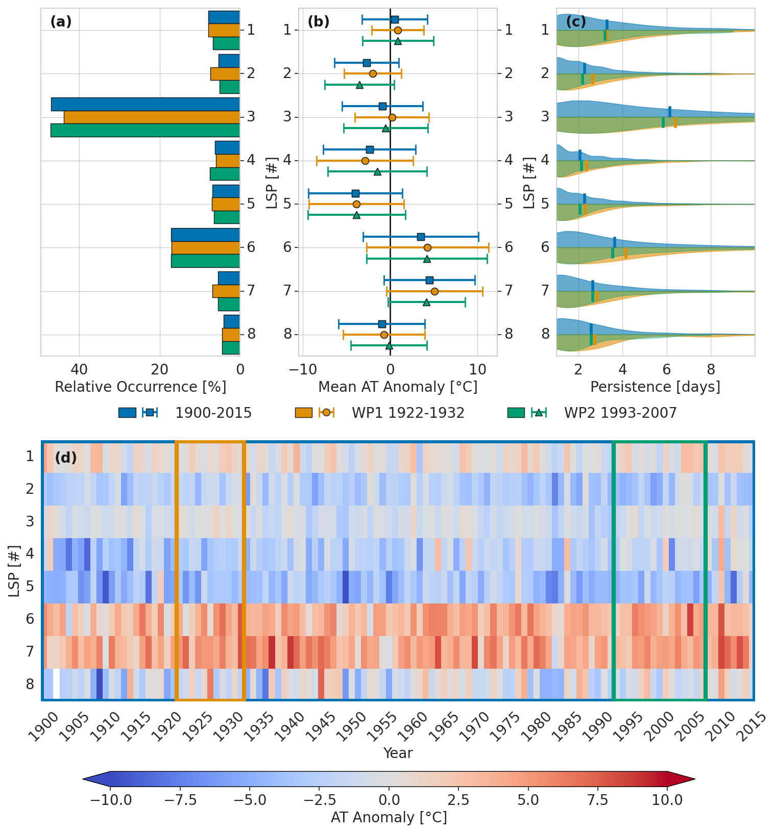 Figure 4Summary of the evaluation of the LSPs examined across the study periods. The study periods are color-coded throughout the plot as follows: WP1 (1922–1932) in orange, WP2 (1993–2007) in green, and the full period (1900–2015) in blue. (a) Distribution of relative occurrence of each LSP across the study periods. (b) Average AT anomaly per LSP, with markers indicating the mean anomaly and whiskers representing ± 1 standard deviation. (c) Distribution of persistence in days per LSP, with bold lines indicating mean lengths. The full period is at the top and both WPs at the bottom. (d) Annual average AT anomaly per LSP, with coloured frames representing the study periods.