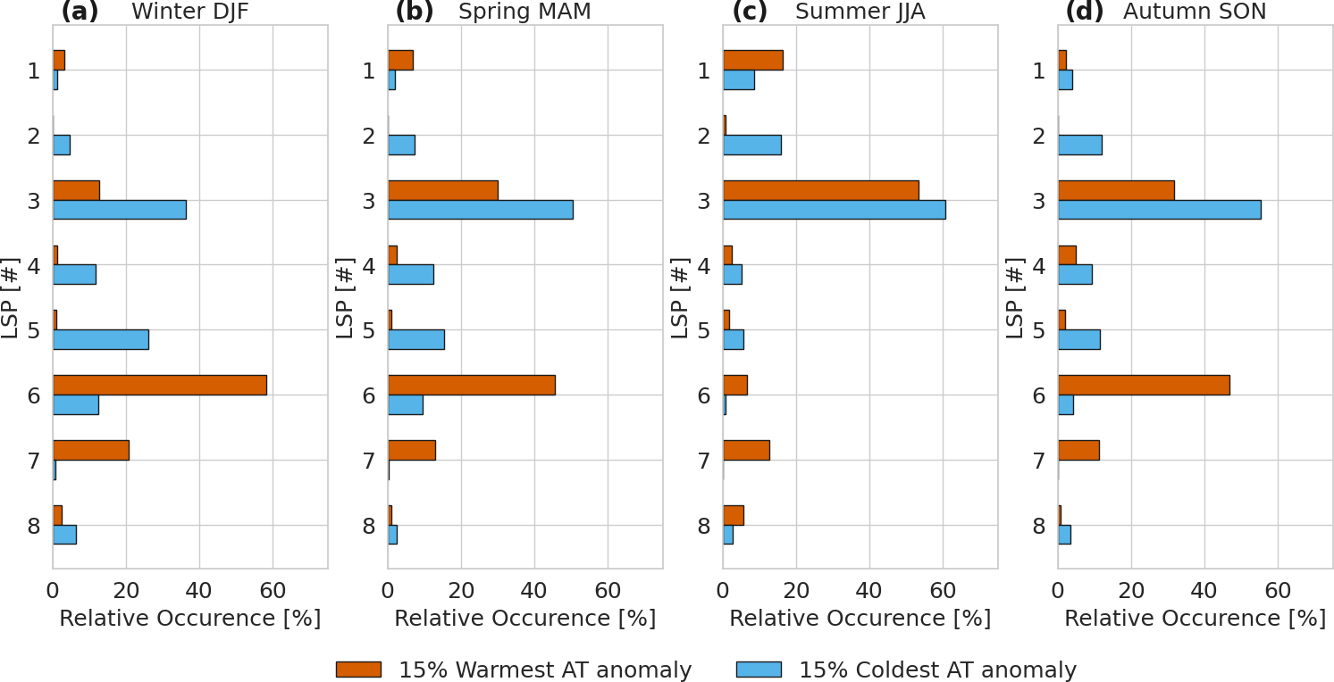The analysis reveals distinct seasonal patterns in LSP occurrences during extreme AT anomalies. LSP3, the most common pattern, is predominantly associated with the coldest days across all seasons. However, for the warmest days, the seasonal associations vary. In winter, spring, and autumn, LSP6 is frequently linked to extreme warmth, while in summer, LSP3 is the dominant pattern. LSP1 contributes to some warm days but primarily during summer, when it is also connected to some cold days. LSP7 is exclusively associated with warm days, whereas LSP2, as well as LSPs 4 and 5, are primarily connected to cold days, with occasional instances leading to warm anomalies. LSP8 shows seasonal variability: in winter, spring, and autumn, it is linked to extremely cold days, but in summer, it is more frequently associated with warm anomalies.