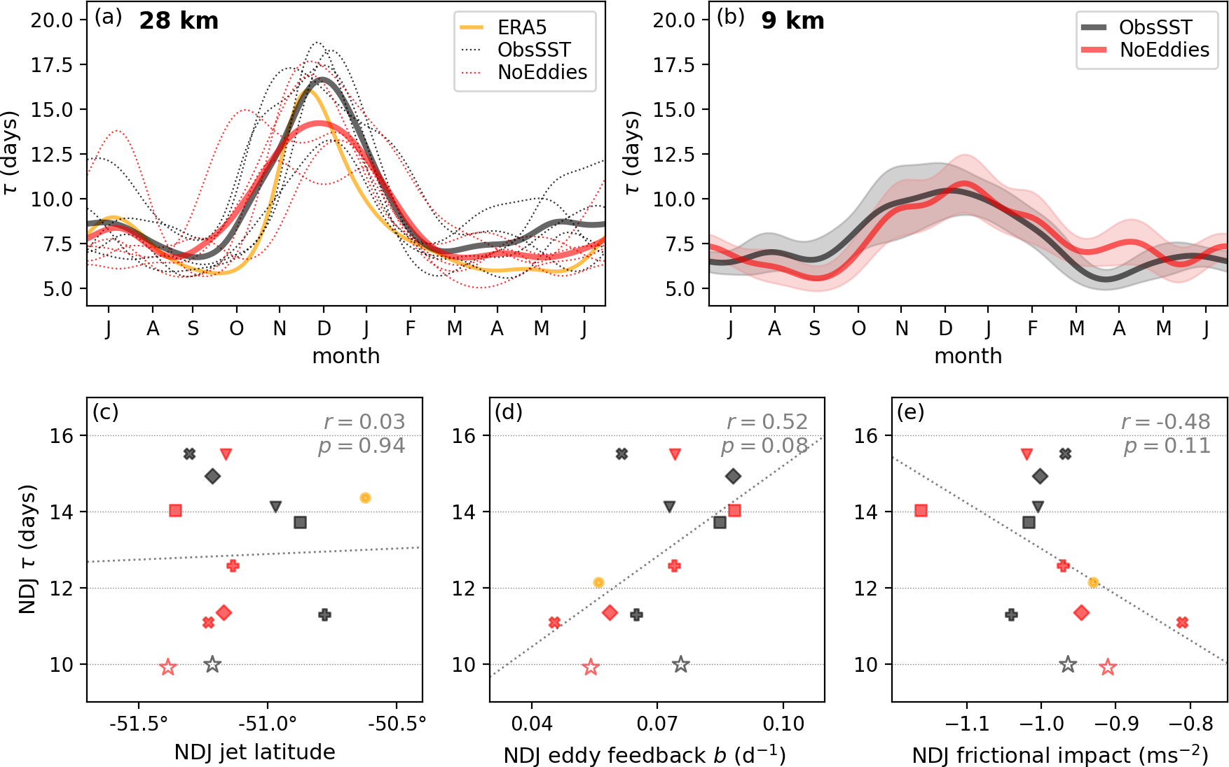 Figure 4Analysis of the IFS-AMIP idealized experiments (black for ObsSST and red for NoEddies; yellow for ERA5 as reference): (a) SAM decorrelation timescale (τ) as a function of month for 28 km simulations (dashed for individual ensemble members and solid for ensemble means). (b) Similar to panel (a) but for 9 km experiments (shades for the ±1 standard deviation of τ from the 1000 bootstrap resampling). (c) Scatter plot of τ (days; y axis) and westerly jet latitude (x axis; filled-color markers for 28 km; hollow stars for 9 km simulations). (d)(e) Similar to panel (c) but with x-axis variable replaced with the eddy feedback strength and frictional impact, respectively. In panels (b)(d), the same marker shape indicates the same ensemble member. The gray dotted line represents the linear regression fit, and the correlation coefficient and p value are indicated in the top-right corner.
