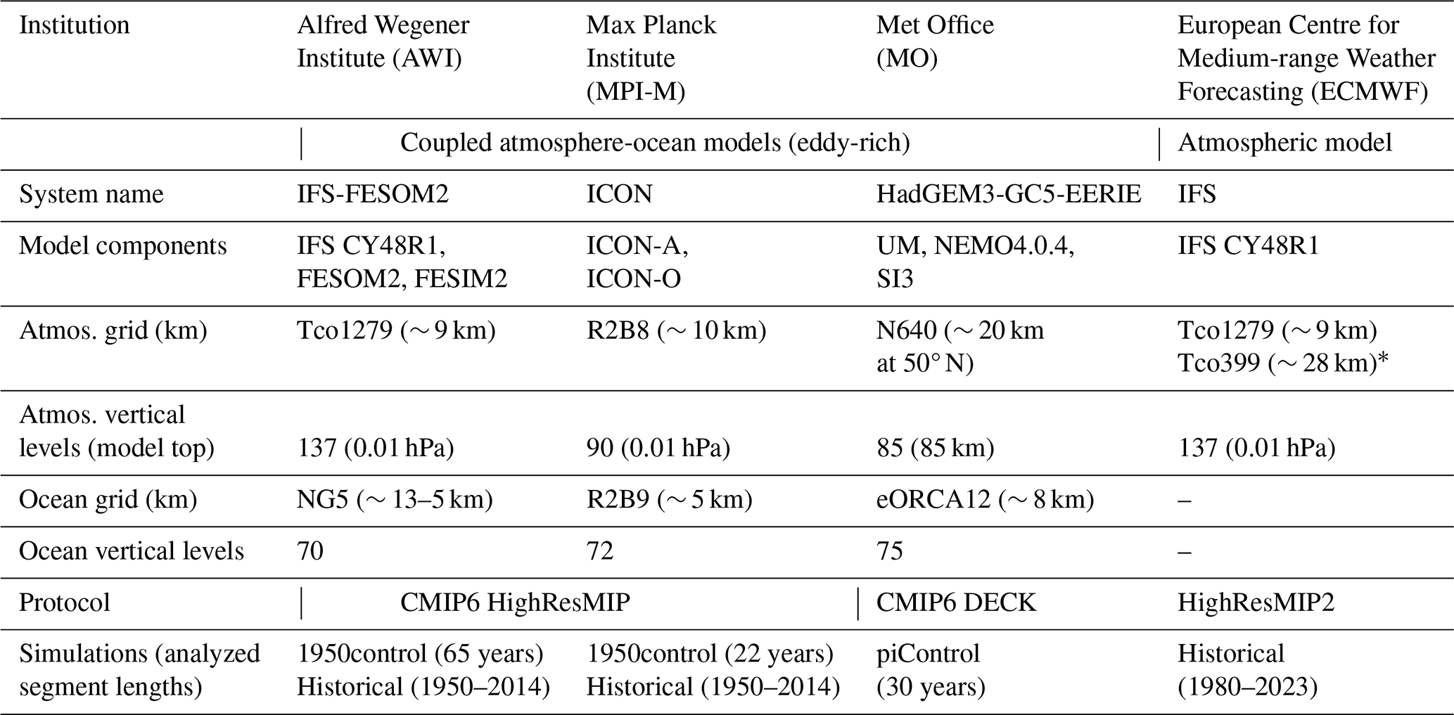 This study evaluates the preliminary EERIE Phase 1 simulations (Wachsmann et al., 2024). To facilitate direct comparison across experiments, all outputs were regridded to a uniform 0.25° × 0.25° grid prior to analysis, except for the westerly jet location identification (Sect. 3.2). A detailed description of the EERIE models can be found in Roberts et al. (2024a), and Table 1 briefly summarizes the simulations used in the current study. IFS-FESOM2 and ICON model simulations are being conducted following a protocol similar to the CMIP6 HighResMIP (High Resolution Model Intercomparison Project; Haarsma et al., 2016). The HadGEM3-GC5-EERIE model simulation follows protocol similar to CMIP6 DECK (Diagnostic, Evaluation and Characterization of Klima; Eyring et al., 2016). HighResMIP differs from CMIP6 DECK primarily in its use of 1950s' climate conditions instead of 1850s' as the initial state and a shorter spin-up ( 50 years instead of  200 years; which have been discarded and not counted in the simulation length shown in Table 1) due to the computational demands of high-resolution models. Using the IFS-FESOM2 model, we analyze a 65-year control simulation conducted under fixed 1950 forcings (referred to as 1950control), along with a historical simulation covering the period from 1950 to 2014. For the ICON model, the 22-year 1950control and the historical run are analyzed. For the HadGEM3 model, we examine a 30-year pre-industrial control simulation (piControl) forced by 1850 conditions.