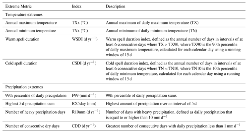 Table 1Metrics of daily temperature and precipitation extremes used in this study.