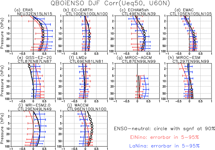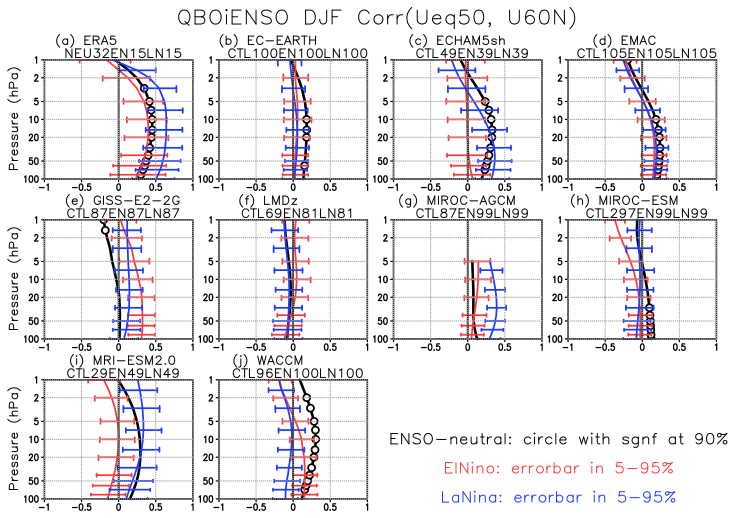 Most model correlations exhibit smaller uncertainties than ERA5 due to larger sample sizes. Models such as ECHAM5sh, EMAC, EC-EARTH, MIROC-ESM, MRI-ESM2.0, and WACCM display positive correlation profiles in CTL, although these correlations are weaker than in ERA5. Most models do not show significant correlations in EN; only four models (MRI-ESM2.0, ECHAM5sh, EMAC, and MIROC-AGCM) out of nine reproduce observed positive correlations with confidence intervals excluding zero at certain altitudes. Kawatani et al. (2025, their Fig. 2) presented simple time–height cross-sections of monthly zonal-mean equatorial zonal winds in EN and LN, showing that the QBO in ECHAM5sh in EN was irregular, with stalling in the downward propagation of both easterlies and westerlies. They also showed that the QBOs in GISS and LMDz in LN were more irregular, with westerly phases sometimes failing to propagate into the lower stratosphere. These results indicate that most models exhibit weak positive correlations consistent in sign with ERA5, but in most cases these correlations are not statistically significant. This suggests that inter-model differences in the QBO–polar vortex relationship, or differences between experiments within the same model, may not be clearly distinguishable.