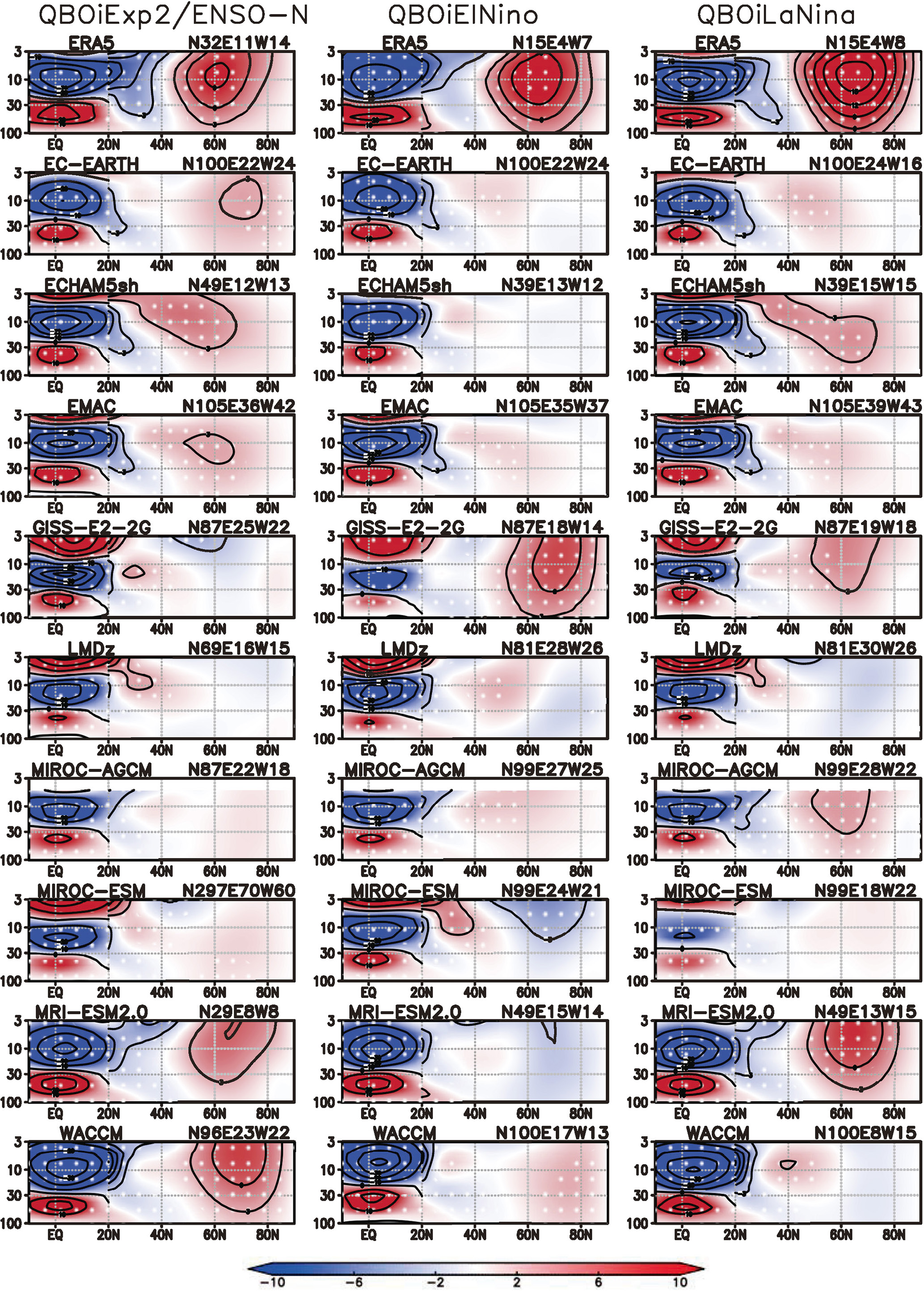 We use nine AGCMs and ESMs participating in the QBOi project and conduct three experiments. The first one is the QBOi Experiment 2 using a climatological annual cycle of SST and sea ice conditions (Butchart et al., 2018). We hereafter refer to it as the control (CTL) experiment. The other two experiments are the QBOiENSO experiments, QBOiElNino and QBOiLaNina (Kawatani et al., 2025). They are time-slice experiments consistent with the QBOi Experiment 2 design but with prescribed “perpetual El Niño” and “perpetual La Niña” SST anomalies. They are referred to hereafter as the EN and LN experiments, respectively. The models that performed the CTL, EN, and LN experiments are EC-EARTH3.3 (hereafter EC-EARTH for short), ECHAM5sh, EMAC, GISS-E2-2G (GISS), LMDz6 (LMDz), MIROC-AGCM-LL (MIROC-AGCM), MIROC-ESM, MRI-ESM2.0, and CESM1(WACCM5-110L) (WACCM for short). Their characteristics have been described in Butchart et al. (2018) and Kawatani et al. (2025). MRI-ESM2.0 (Yukimoto et al., 2019) is an updated version of the model documented in Butchart et al. (2018), and it includes changes aimed at improving the modeled QBO (Naoe and Yoshida, 2019). The lengths of model integrations for each of the three experiments are presented in Table 1. Due to data availability issues, EMAC is not included in the results presented in Sects. 4 and 5.1 below.