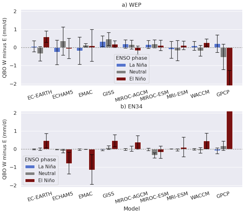 Previous studies have shown that the QBO signal during DJF is particularly strong in specific regions of the tropical Pacific: the western equatorial Pacific (WEP, 5° S–5° N, 120–170° E) and the Niño3.4 region (EN3.4, 5° S–5° N, 170–120° W) (Gray et al., 2018; Serva et al., 2022; García-Franco et al., 2022). To test the sensitivity of precipitation in these regions to the QBO phase, we analyze the area-averaged precipitation in both regions as a function of QBO and ENSO phases (Fig. S7). The QBOi models show considerable spread in the precipitation climatology. However, all simulations reproduce the observed ENSO signal: wetter conditions in the EN3.4 region and drier conditions in the WEP in EN, with the opposite pattern in LN, regardless of the QBO phase.