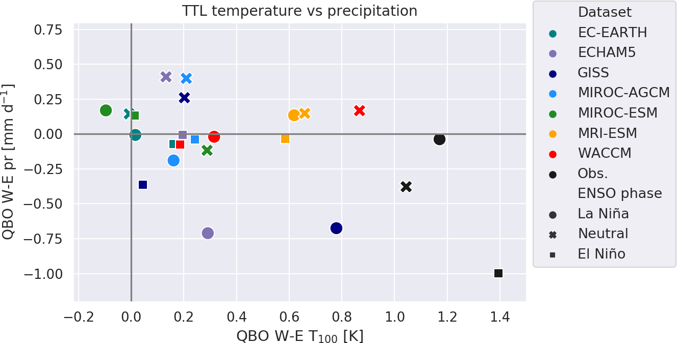 One possible reason for the inter-model and inter-experiment spread in precipitation response is variability in QBO-related temperature anomalies at the equator, arising from the QBO-induced mean meridional circulation and thermal wind balance. The QBO's impact on the tropical tropopause layer (TTL) is important for its teleconnection via the tropical pathway (Haynes et al., 2021; Hitchman et al., 2021). A common hypothesis is that when a cold QBO anomaly occurs in the TTL, convection can penetrate to higher altitudes, locally amplifying the zonal-mean QBO cold anomaly (Tegtmeier et al., 2020). Figure 10 shows a scatter plot of the QBO-W minus QBO-E temperature differences at 100 hPa versus precipitation differences over the WEP. One might expect models that have larger TTL temperature signals or static stability to also show stronger precipitation signals. ERA5 shows larger QBO differences in TTL temperature than the models, with the strongest signals occurring during El Niño winters. Also, the GPCP precipitation signal is largest during El Niño, possibly due to the coincidence of the strongest El Niño events with the westerly QBO phase. Removing these strongest El Niño events (1982–1983, 1997–1998, 2015–2016) significantly alters GPCP precipitation signal (Fig. S4). For the all-winter composites, the Pacific signal dramatically weakens when excluding these cases (Fig. S4a, b). During the El Niño winters, only the eastern Pacific significantly changes. Some models, such as GISS and ECHAM5sh, exhibit strong temperature signals and strong negative precipitation signals in LN. However, most models show modest positive temperature differences without a clear precipitation signal. Overall, the QBOi models underestimate QBO TTL temperature anomalies (Serva et al., 2022), which may explain their weak precipitation signals.