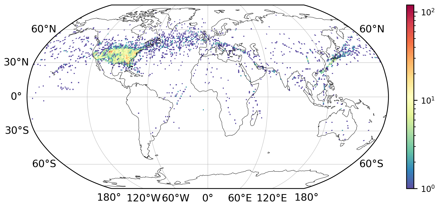 Figure 2The number of the moderate-or-greater (MoG) turbulence events identified in each 1° × 1° grid box. The number of events is substantially higher over the contiguous U.S. and major flight routes and most of them are in the Northern Hemisphere. Note that the colour scale is logarithmic.