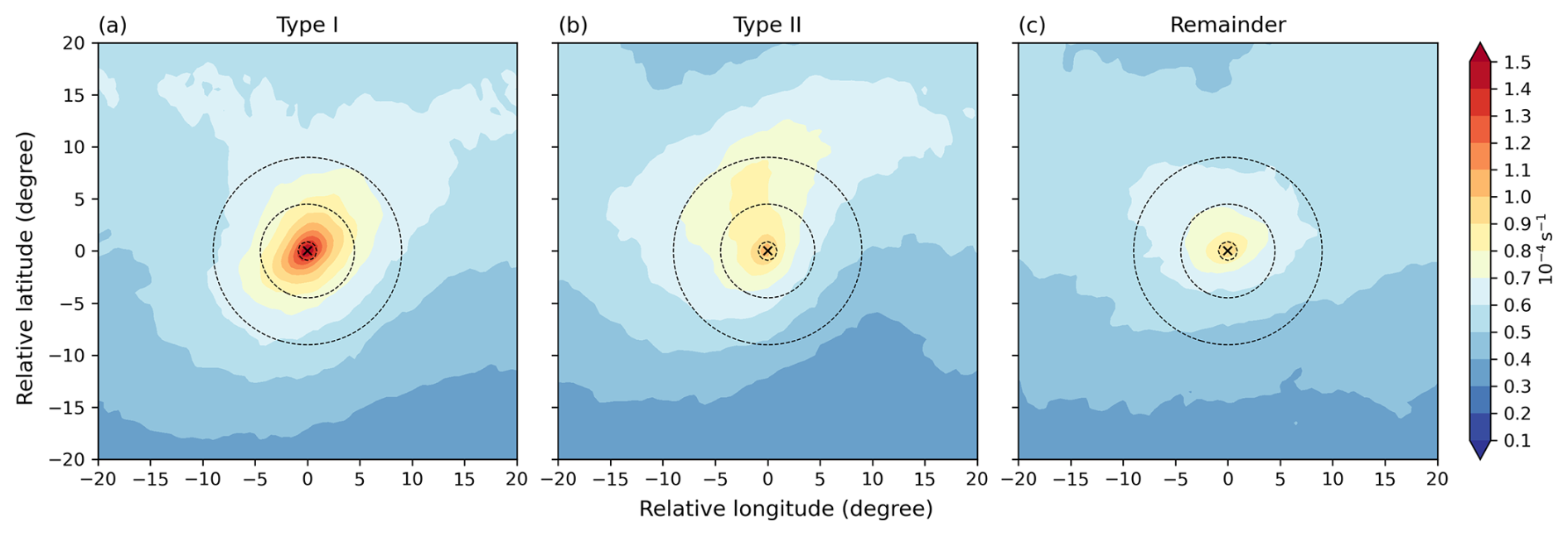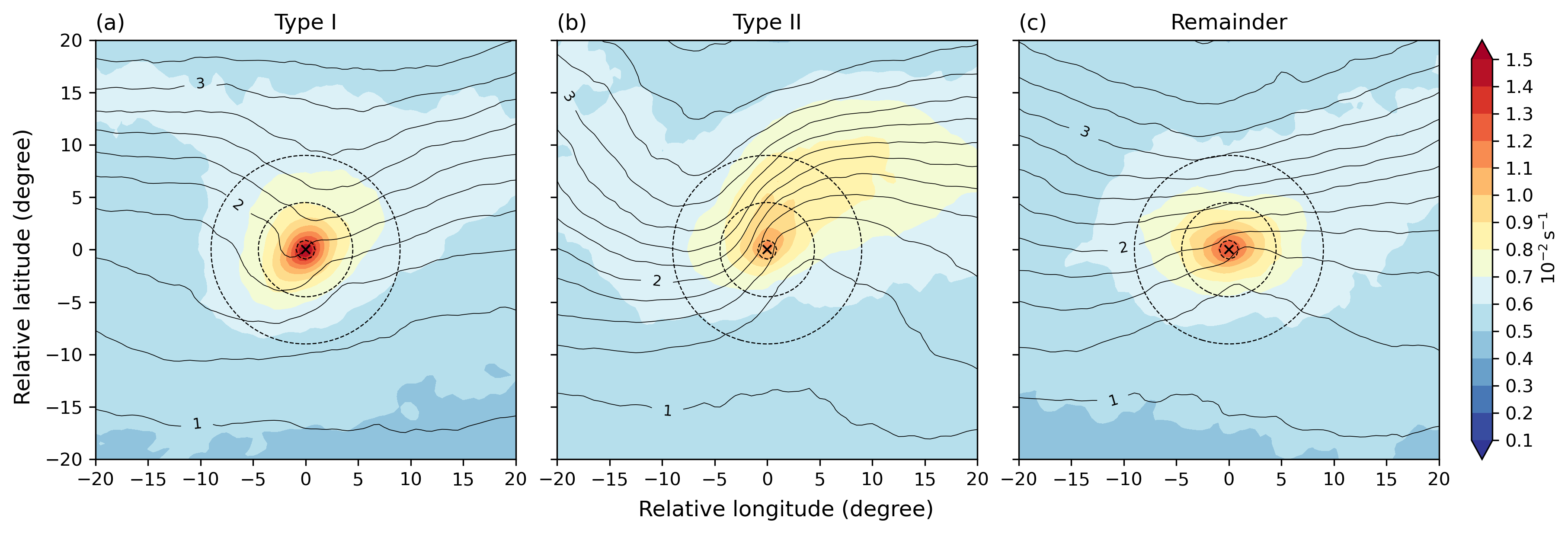 The differences in the environmental conditions associated with these two types of events are analysed by comparing the composite fields for each category. First, type I events stand out with substantially higher values (around 50 % higher) of horizontal deformation in the immediate neighbourhood of the events when compared to the other two categories (Fig. 6) with the peak of horizontal deformation pinpointing the event location. RWB is known to be associated with high horizontal deformation (Spensberger and Spengler2014) and high horizontal deformation is also a well-known physical quantity useful for CAT forecasting (e.g. Endlich1964; Ellrod and Knapp1992). We may hence postulate a linkage between RWB and CAT, bridged by high horizontal deformation.