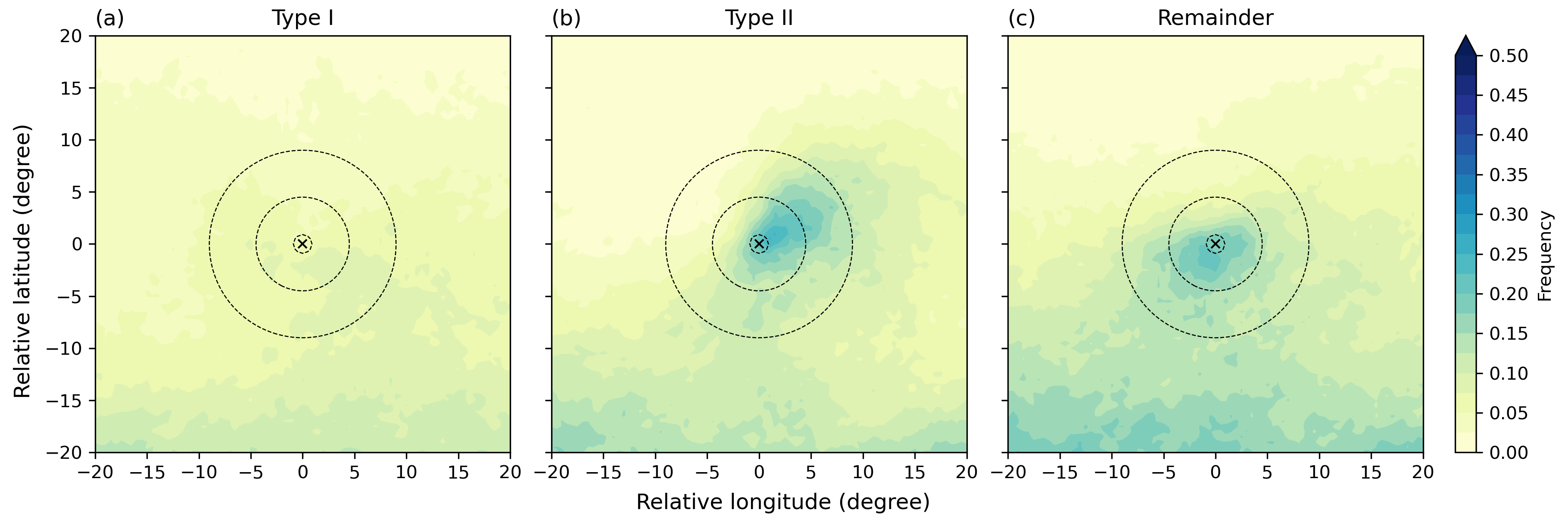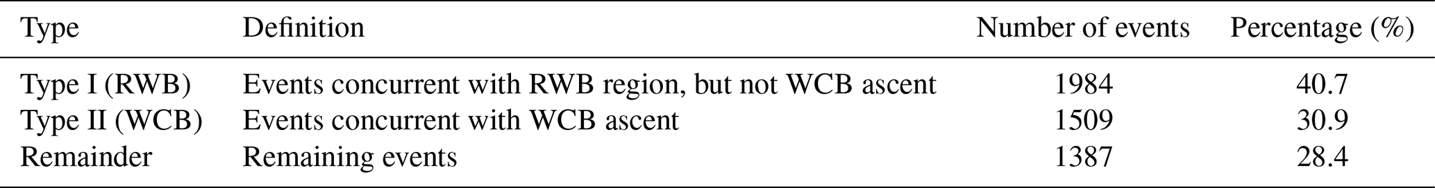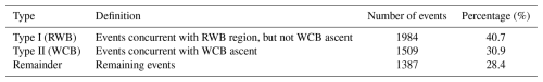 The events are allocated to three mutually exclusive categories. Type I are events concurrent with RWB region but not with WCB ascent while type II are all events concurrent with WCB ascent. The remaining events are collectively referred to as “remainder”. The WCB ascent concurrent events form one category by itself because the WCB ascent mask has a spatial coverage much smaller than that of RWB region. Physically, type I is therefore the group of events concurrent with RWB while type II is the group of events occurring above WCB ascent. The number of events in each category is tabulated in Table 3 and their corresponding geographical distributions are shown in Fig. 5.