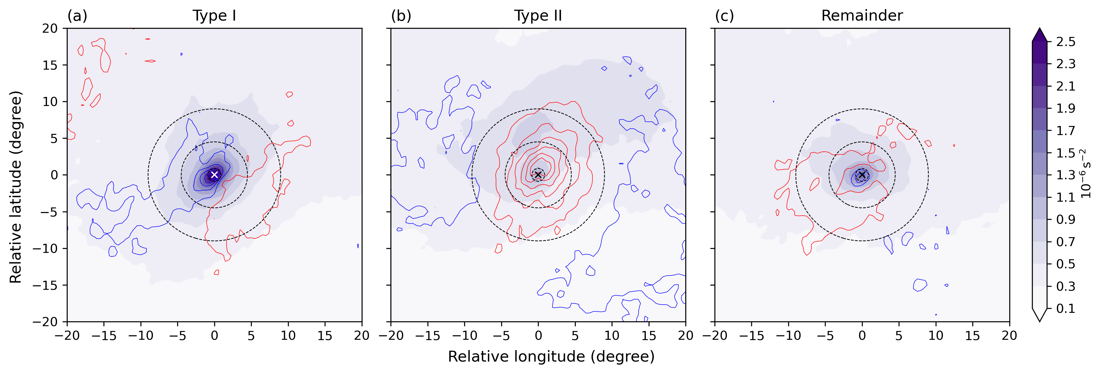 Figure 6Composites of horizontal deformation (colours) on the isobaric surface of the MoG turbulence events for (a) type I, (b) type II, and (c) remainder events. The event location is denoted by the cross at the centre and the dashed circles indicate 100, 500, and 1000 km distance from it.