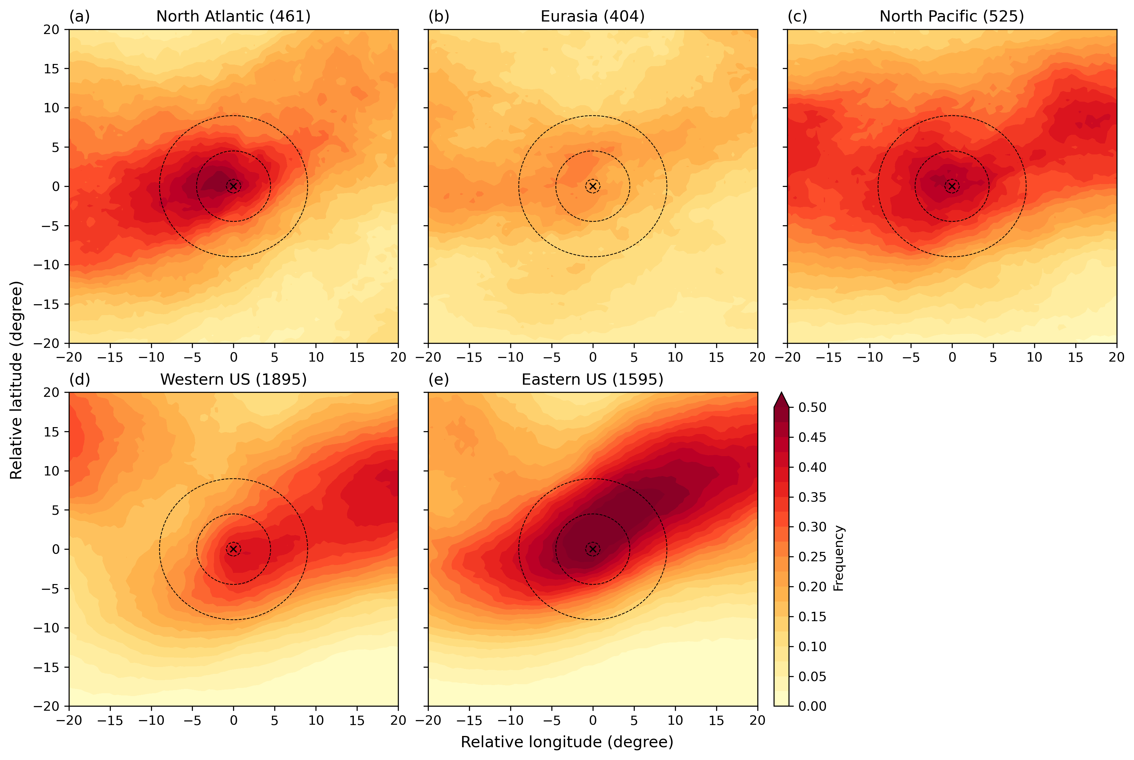 The weather feature masks are first interpolated to a translated latitude–longitude grid with its origin being the event location and grid points within 1000 km from the event are extracted. The interpolation is needed to minimise the distortion due to the poleward convergence of longitudes and the same technique is used also for the event-centred composites (Sect. 3.1). The 1000 km radius is chosen from the typical spatial scale of synoptic features and this region is considered the neighbourhood of the event. A weighted sum of the number of grid points being covered by the weather system mask is calculated and the weight function is inversely proportional to distance squared r2, with value capped at 11002 km−2 for points less than 100 km away from the event. The distributions of the weighted sum (Fig. S6) are examined for different weather features and most of them show a separation between clusters representing minimal (low values) and maximal (high values) overlap. A threshold value of 0.0015 km−2 is chosen with the aim to remove the cluster that has zero or minimal overlap of the weather feature mask with the event neighbourhood. If the weighted sum has a higher value, the event is considered to be associated with the weather feature, or concurrent with this weather feature. This concurrence definition is used to categorise an event according to its associated weather features.