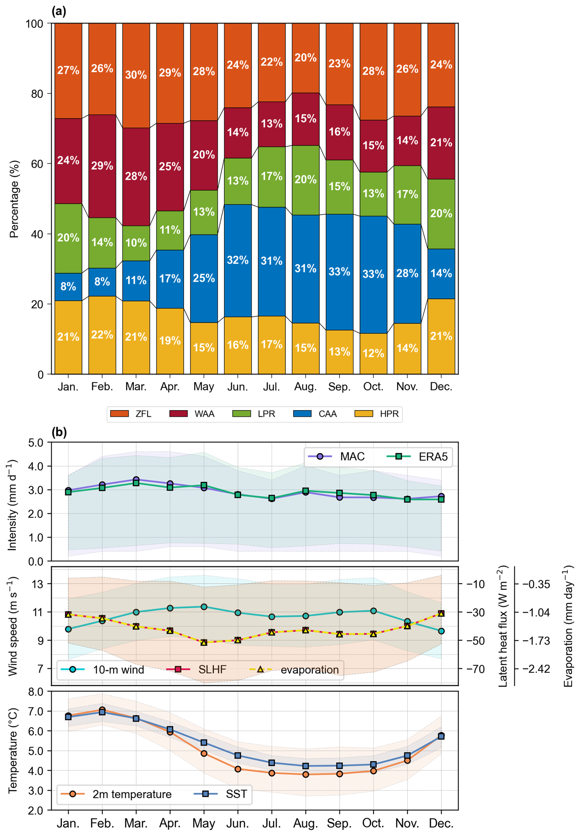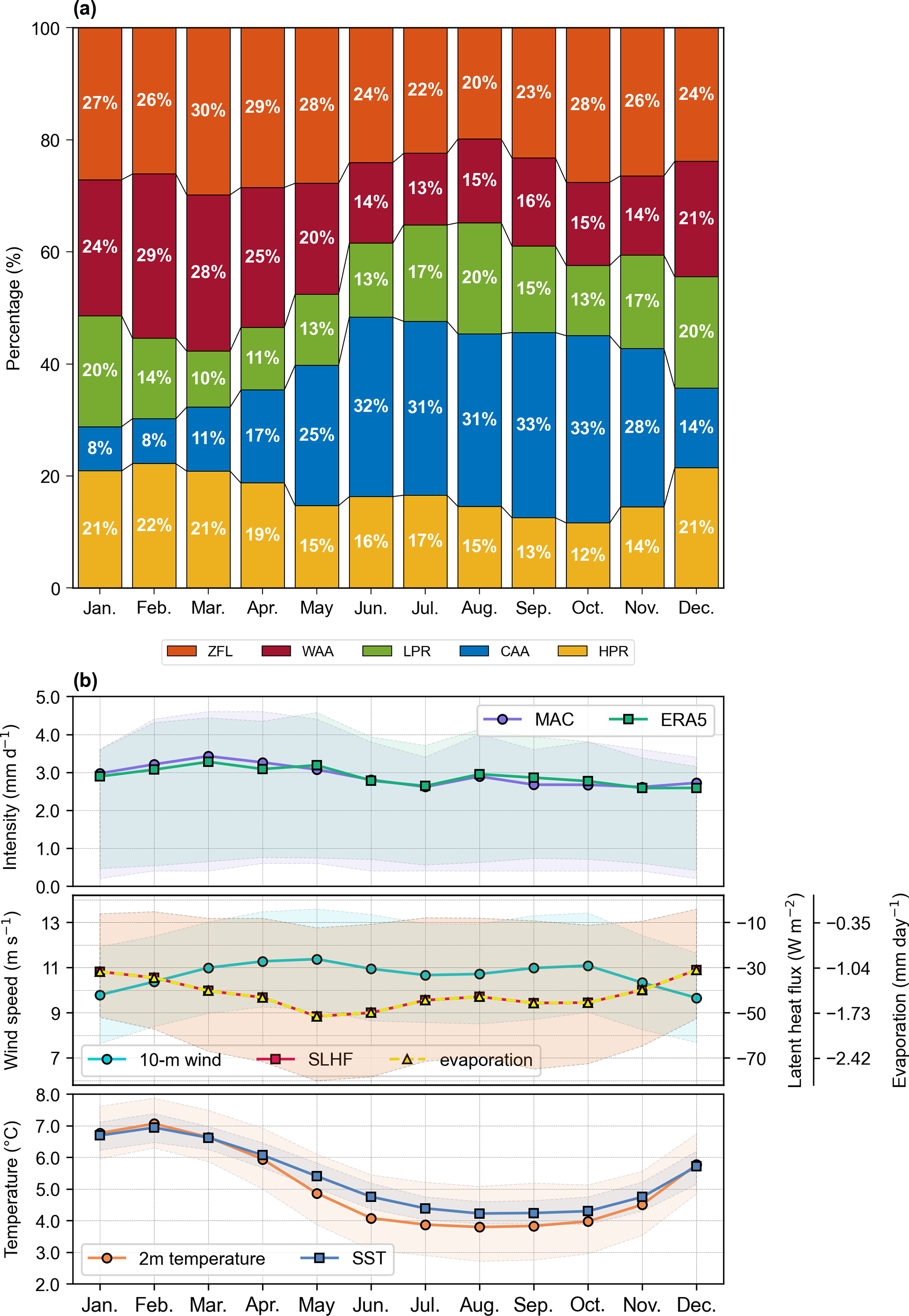 Figure 4(a) Mean monthly frequency of occurrence (%) of each cluster from 1979 to 2023. (b) Monthly means based on daily variables. Precipitation intensity (mm d−1) for MAC observations (purple) and ERA5 (green) (top). ERA5 10 m wind speed (m s−1, green), surface latent heat flux (SLHF, W m−2, red), and evaporation (mm d−1, yellow) (middle). ERA5 2 m air temperature (°C, orange) and SST (°C, blue) (bottom). The shaded areas for each variable represent the range from the 25th to the 75th percentile.