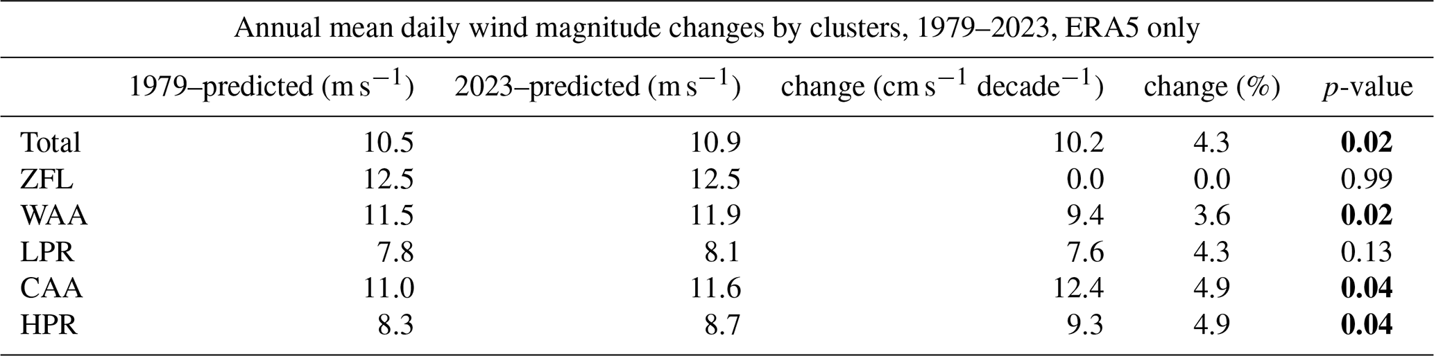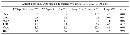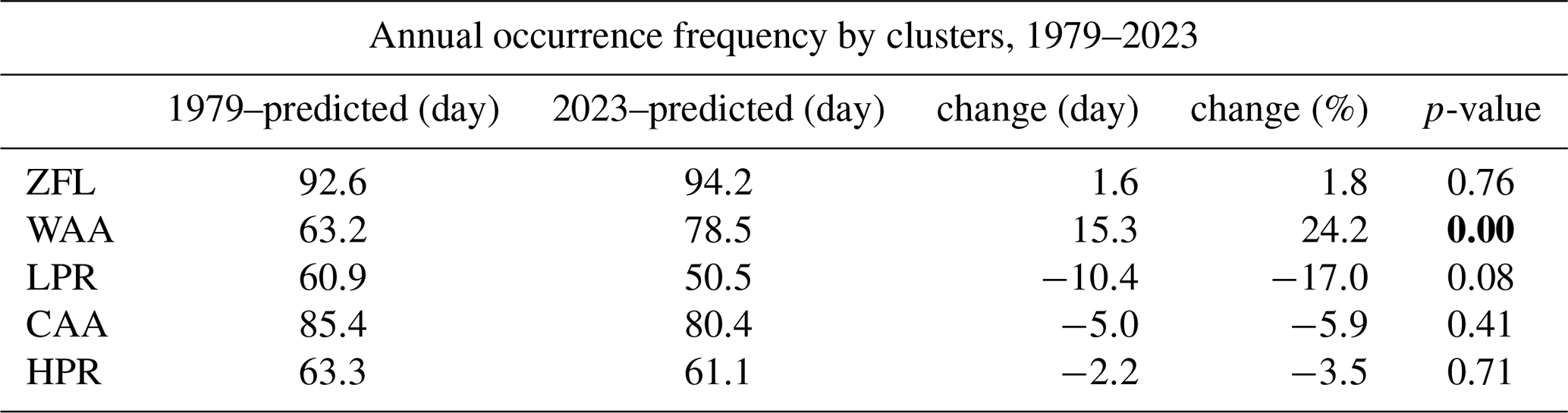 Table 1Trends of annual occurrence by number of days for each cluster with increase change and slope p-value (p<0.05 indicating a statistically significant trend, shown in bold). Note: The values for 1979 (predicted) and 2023 (predicted) represent the endpoints of the corresponding regression lines.