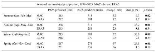 Table 2Seasonal accumulated precipitation changes (mm) for MAC and nearest ERA5 from 1979 to 2023, with the season definition including a 1-month lag.