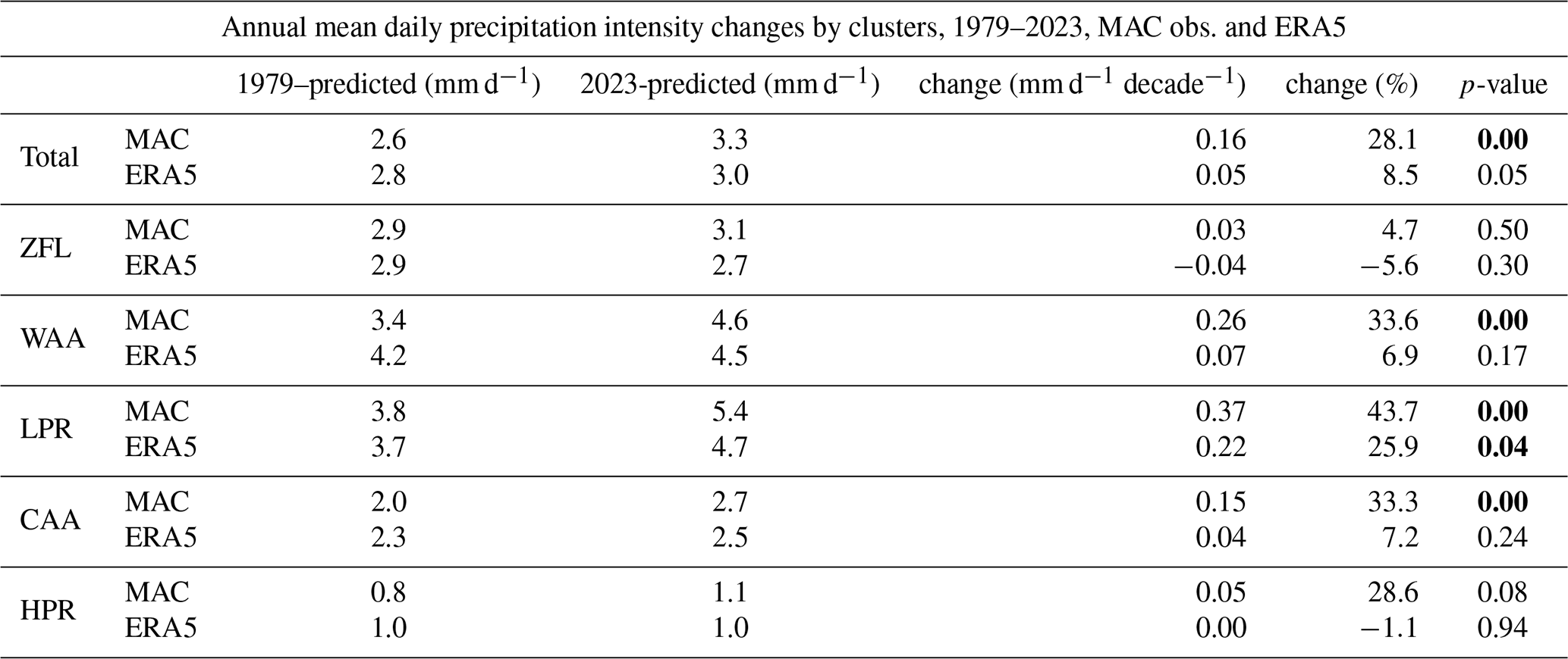 Turning to the 45-year trends in the annual mean daily precipitation (Fig. 5), the intensity of the daily MAC precipitation increases 28.1 % (2.6 to 3.3 mm d−1), while ERA5 only increases 8.5 % (2.8 to 3.0 mm d−1), both of which are statistically significant. Breaking this down into the five synoptic patterns, MAC has a positive trend for each one, gaining statistical significance for the warm air advection, low pressure and cold air advection regimes. For ERA5, only the increase in the daily intensity of the low pressure regime is statistically significant. In contrast, the trends for warm and cold air advection show slight increases, while the zonal flow and high pressure regimes exhibit minor negative trends; however, none of these are statistically significant.