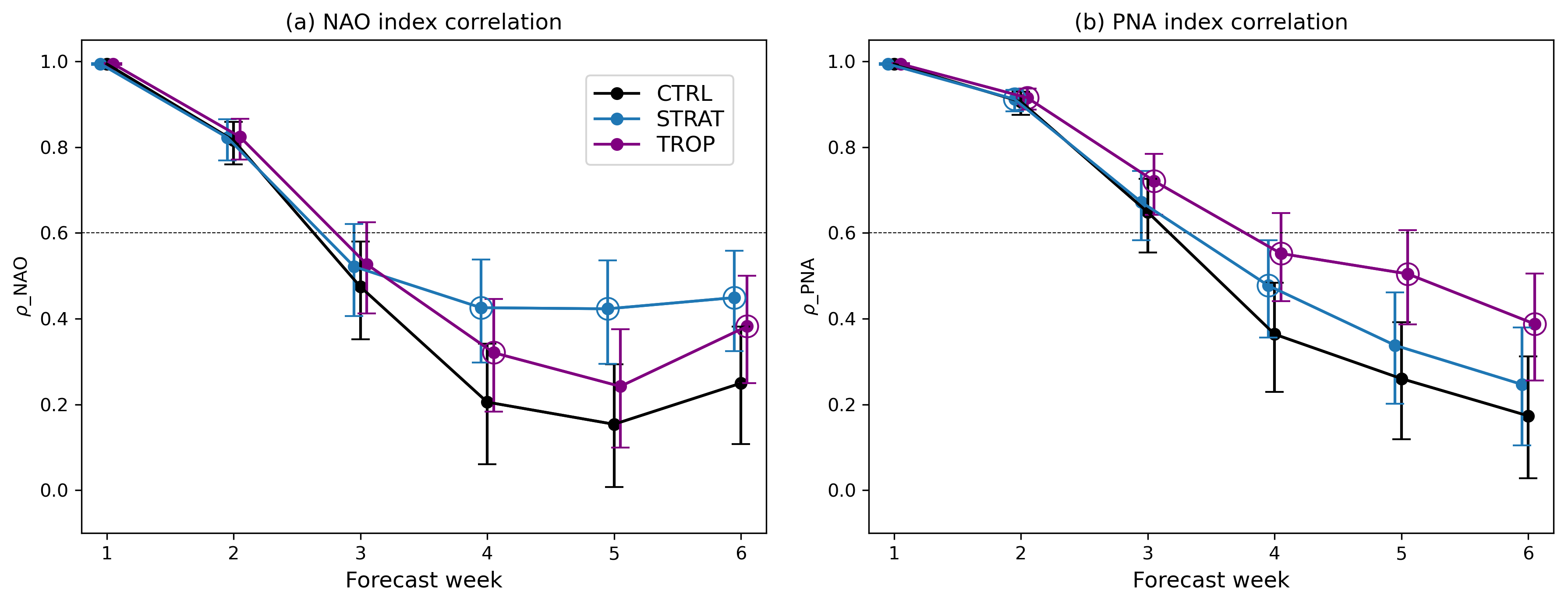 To highlight the regional changes, we show the correlation skill for weekly NAO and PNA indexes (Fig. 2). NAO and PNA indexes provide an integral picture of the atmospheric flow over the North Atlantic /European and North Pacific /North American regions respectively. In CTRL, the NAO skill is 0.47 for week 3 but declines to ∼ 0.2 for longer lead times. In STRAT, NAO skill is 0.52 for week 3 and remains above 0.4 for longer lead times suggesting considerable influence from the stratosphere-troposphere coupling as expected. Charlton-Perez et al. (2021), using a statistical model, estimated that for an 11-member forecast model with a perfect stratosphere the NAO week 3 skill is ∼ 0.52, consistent with what we find in our experiments. In TROP the increase in the NAO skill is smaller than that in STRAT but still significantly different from CTRL during weeks 4 and 6. Karpechko et al. (2024) using the same dataset suggested that both direct tropospheric pathway (Barnes et al., 2019) and indirect stratospheric pathway contribute to increased NAO skill in TROP.