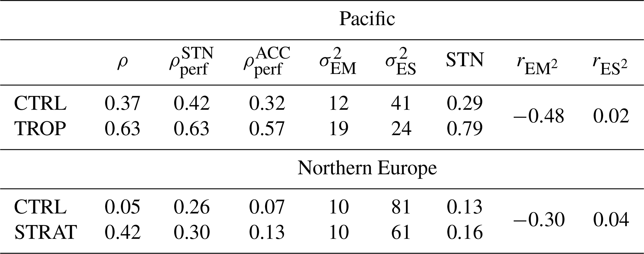 Based on the analysis of Fig. 7 and Table 4 we highlight several important results regarding the northern Europe location: (i) variability of EM2 does not increase between CTRL and STRAT but the skill does; (ii) a reduction of EM2 in many individual forecasts leads to increased skill, which cannot be reconciled with the assumption that EM2 is proportional to the magnitude of signal; (iii) (which is directly proportional to ) is considerably larger than ρ in CTRL but they are closer to each other in STRAT. Taken together these results suggest that in CTRL overestimates the variability of the predictable signal, i.e. EM does not represent the signal in CTRL sufficiently well. Note that, unlike , is comparable to ρ in CTRL but it strongly underestimate ρ in STRAT demonstrating some sensitivity of the results to the definition of ρperf.