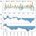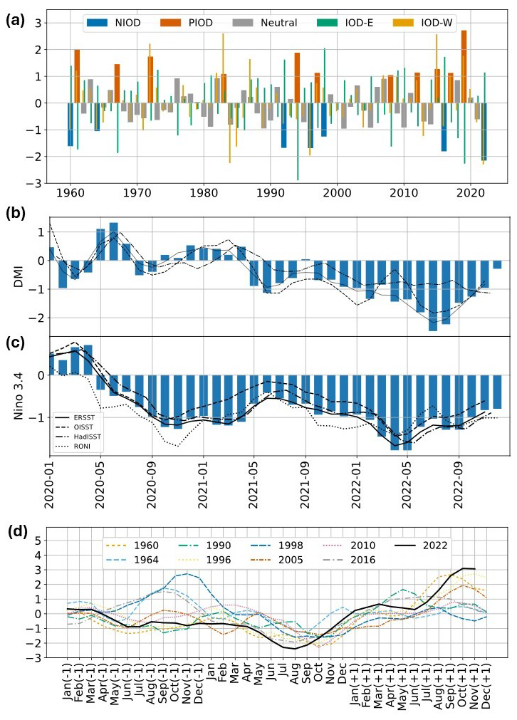 Figure 1The September–November (SON) DMI index, and the IOD east and west pole indices, for the period 1960–2022 based on ERSST dataset. IOD events are categorized as negative (positive) based on whether the normalized DMI was less than (greater than) −1 (+1) standard deviation; (b) the monthly DMI index from ERSST (bars), and the three-month running mean for ERSST, OISST and HadlSST (lines) for the period 2020–2022; (c) same as (b) but for the Niño 3.4 and the relative Niño 3.4 index; and (d) The time evolution of the 3 month running mean of DMI based on ERSST dataset for all nIOD events since 1960. (−1) on the x axis indicates the year previous to the nIOD event, and (+1) indicates the subsequent year. The black curve denotes the evolution of DMI from NDJ 2021 to OND 2023.