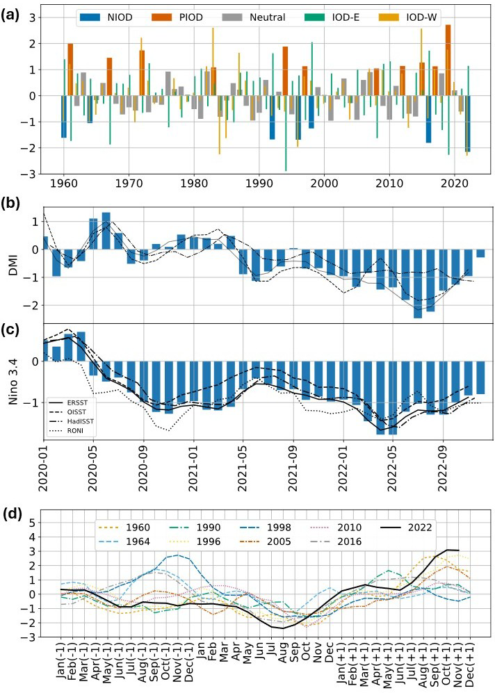 The 2021–2022 nIOD event was, therefore, unique in several aspects: (1) it was the strongest nIOD event recorded during 1960–2022. (2) It peaked during the boreal summer of 2022. (3) nIOD conditions were sustained for a record 19 months, making it the first occurrence of a multi-year nIOD event during 1960–2022. (4) This event co-occurred with a triple-dip La Niña event. Did the triple-dip La Niña of 2020–2022 help in sustaining the nIOD conditions? This study will attempt to answer this question.