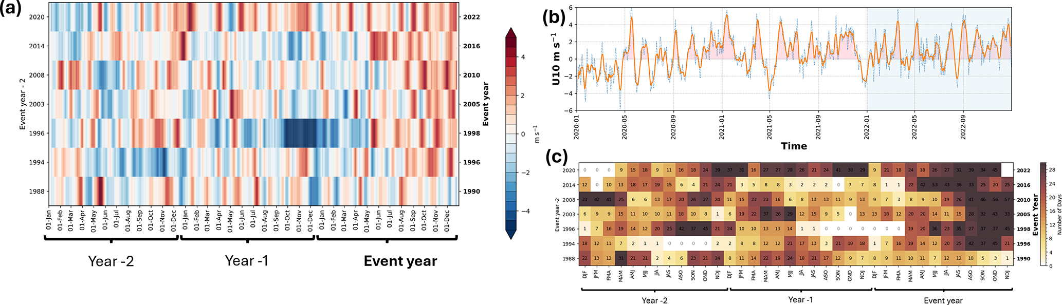Figure 2(a) The 11 d running mean of equatorial (averaged over 5° S–5° N, 60–90° E) 10 m zonal-wind anomalies for all the nIOD events since 1980. The wind anomalies for the previous two years are indicated by Year-2 and Year-1 on the x axis. (b) Evolution of the equatorial 10 m zonal mean wind anomalies (dashed line), its 7 d running mean (solid line) for the period January 2020 to December 2022. (c) The count of the number of days in a 3 month rolling aggregate when the westerly wind anomaly averaged over the equatorial Indian Ocean (5° S–5° N, 60–90° E) was greater than 2 m s−1. The wind anomalies for the previous two years are indicated by Year-2 and Year-1 on the x axis.