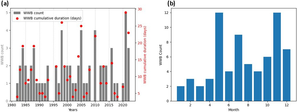Figure 3(a) Number (bars) and cumulative duration (days, red markers) of WWBs. (b) Total WWB count by month for the years 1980–2022 to illustrate the seasonal cycle.
