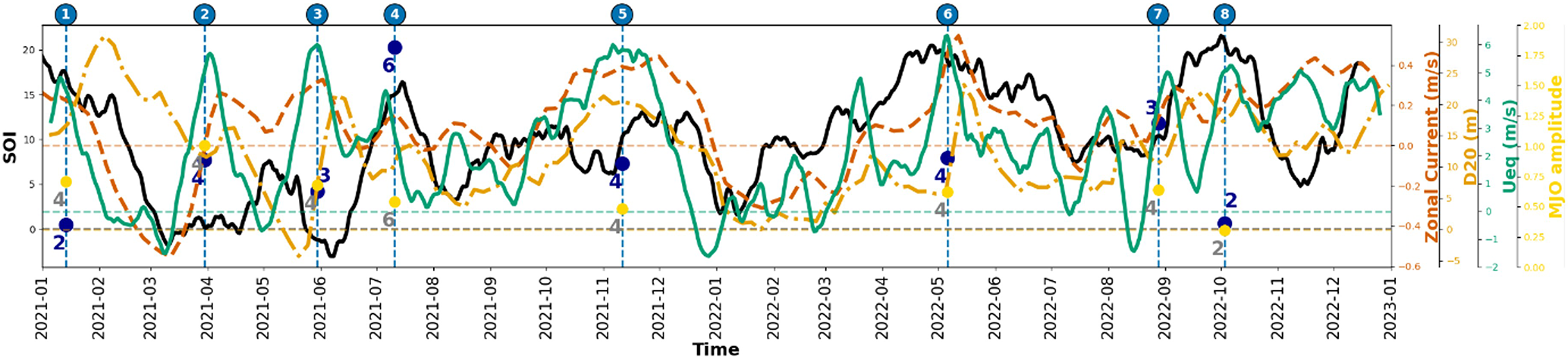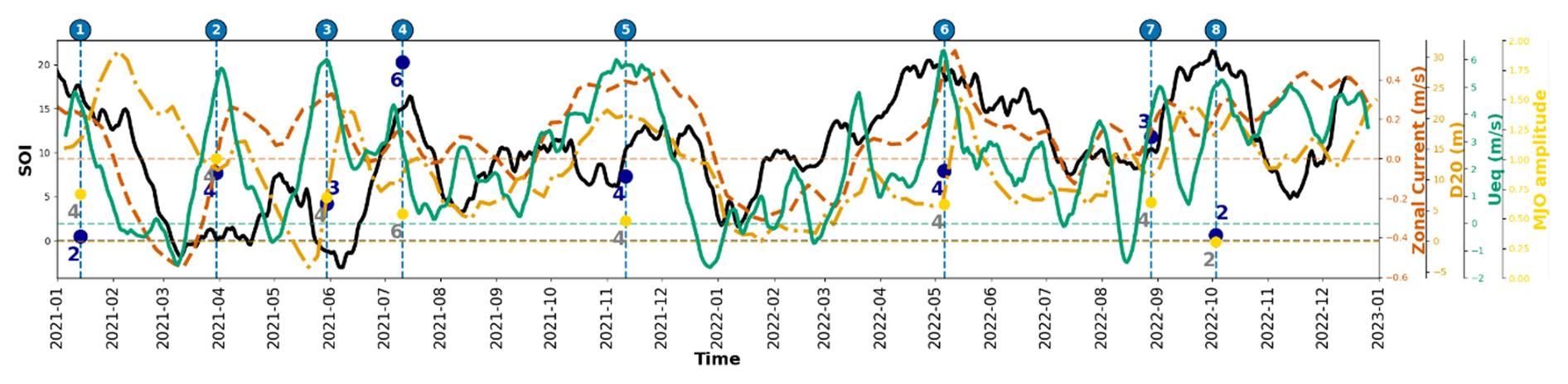The large intra-seasonal variability in tropical convection can be attributed to the equatorial eastward propagating Madden-Julian Oscillation (MJO) and the northward propagating boreal summer intra-seasonal oscillation (BSISO) in the off-equatorial monsoon regimes. The interaction between IOD and BSISO/MJO is well known (Ajayamohan et al., 2009; Shinoda and Han, 2005). Out of the eight WWBs during 2021–2022, six events were associated with phase 4 of MJO (Fig. 5), when the convection is located over the eastern Indian Ocean. Three out of the four events occurring during boreal summer co-occurred with phases 3 or 4 of the BSISO (Fig. 5), during which convection is centered over the eastern TIO and western Pacific, respectively, and are associated with enhanced westerlies in the equatorial IO. Interestingly, these BSISO phases were supported by a peak (three events)/rapidly increasing values of SOI (two events), indicating a possible association between the ENSO state and the BSISO.
