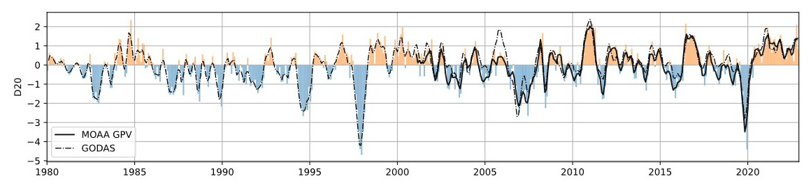 Figure 7The evolution of the 3 month running mean of the standardized anomalies of the depth of the 20 °C isotherm (D20) over the IOD east pole region from NCEP GODAS (dashed lines; 1980–2022), and MOAA GPV data (solid lines; 2001–2022). The bars indicate the monthly anomalies for the NCEP GODAS dataset.