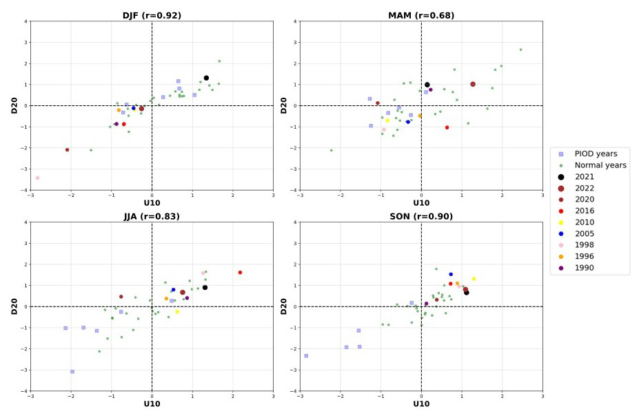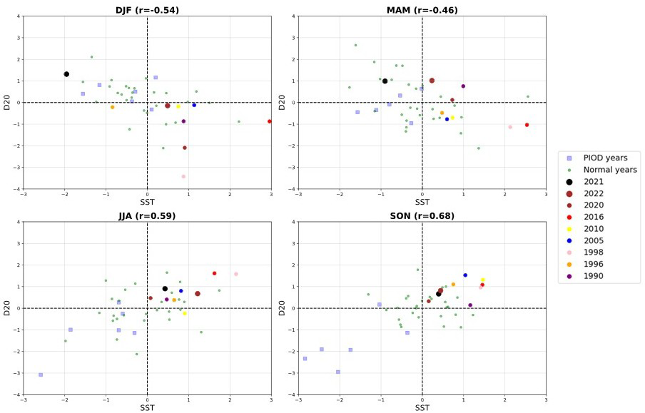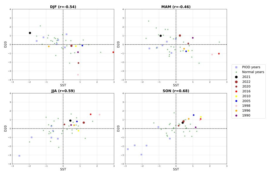 The absence of climatological upwelling in the eastern equatorial TIO is due to the lack of steady climatological easterlies. The climatological south-easterlies from April to October off the Java-Sumatra coast favour coastal upwelling and can trigger a pIOD event. During nIOD events, this upwelling is suppressed. Positive D20 anomalies indicate the suppression of upwelling in the IOD east pole region starting in late 2020 and lasting till the end of 2022 (Figs. 7 and 8). The coupling between SST and D20 in the IOD east pole is positive only during the boreal summer (r=0.59) and fall seasons (r=0.68), as indicated by the scatter plots of SST and D20 in Fig. 9. The large sub-surface heat content during DJF and MAM 2021 was not reflected in the SST due to the negative coupling between SST and D20 (Fig. 9). During JJA 2021, when the SST-D20 coupling is positive, positive SST anomalies emerged in the IOD east pole and were maintained during SON 2021. Positive D20 anomalies (greater than +1 standard deviation) again emerged during MAM 2022 with weakly positive SST anomalies. These positive SST anomalies peaked in JJA 2022, coinciding with the DMI peak, and diminished during SON 2022.