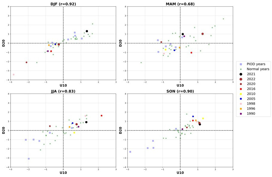 Figure 7 shows the monthly time series of standardized D20 anomalies averaged over the IOD east pole region from MOAA GPV data (2001–2022) and NCEP GODAS (1980–2022). A positive D20 anomaly indicates downwelling. Positive D20 anomalies dominate during 2021–2022 in both datasets. In fact, such a persistent downwelling episode has not been observed since the 1980s. The scatter plots of standardized D20 anomalies over the IOD east pole and the 10 m zonal equatorial wind anomaly for each season are shown in Fig. 8. The individual nIOD events and pIOD events are also indicated. The standardized D20 anomaly remained greater than +0.5 (often greater than or equal to +1) for all the seasons during 2021 and 2022, except for December–February (DJF) 2022. The associated anomalous zonal wind forcing was also very strong (often greater than +1 standard deviation). The positive D20 and surface zonal wind anomalies during DJF and March–May (MAM) seasons during 2021 and 2022 are unlike other nIOD events, where such positive anomalies are seen only during June–August (JJA) and SON. The persistent westerly wind anomalies and the WJs prevailed and conditioned the Indian Ocean to an nIOD state by suppressing the upwelling along the Java-Sumatra coast (Schott et al., 2009).