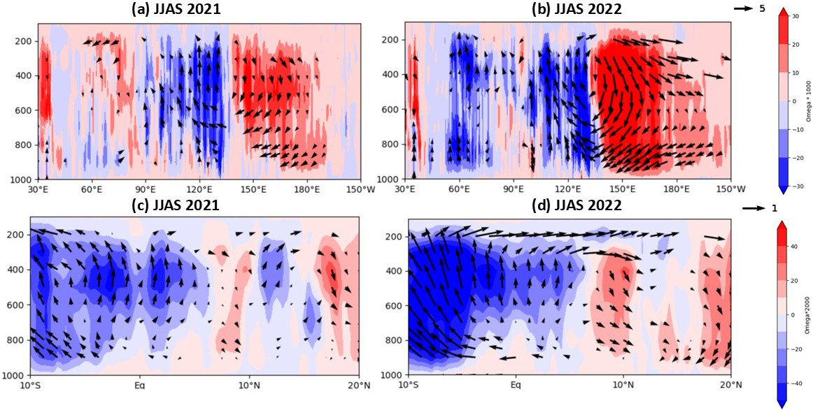 Figure 10The height-longitude section of the anomalous JJAS mean Walker circulation (averaged over 1° S–1° N) for (a) 2021 and (b) 2022, and the height-latitude section of the anomalous JJAS mean Hadley circulation (averaged over 90–110° E) for (c) 2021 and (d) 2022. The vertical velocity (Omega) is scaled by 1000 and 2000 in (a, b) and (c, d), respectively, to elucidate the vertical motion. Vector magnitudes less than 10 and 5 are masked out in (a, b) and (c, d), respectively. The units are m s−1 for the zonal component and Pa s−1 for the vertical velocity.