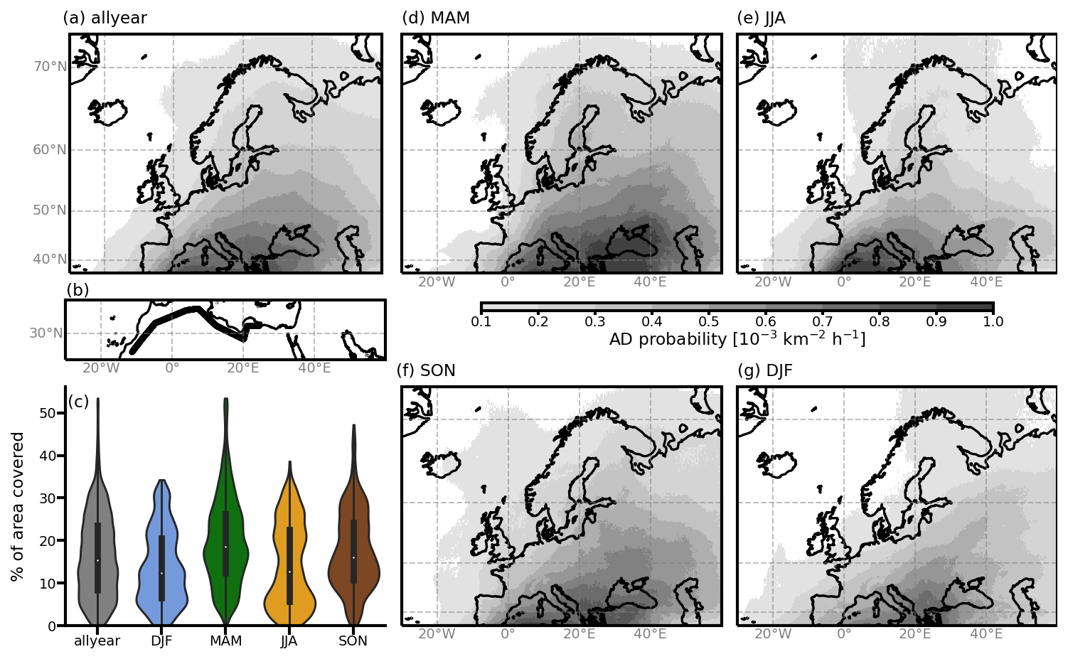 Figure 1(a) Probability of an AD being present in the respective cell, weighted by the cell's area, for the entire 2-year period (allyear) in the shown domain. (b) Locations of the starting points of the trajectories along the “curtain”. (c) Violin plot of the percentage of the area in the domain covered by an AD, per season. The violins are normed to have the same area. (d–g) Same as (a), but for MAM, JJA, DJF, and SON, respectively.