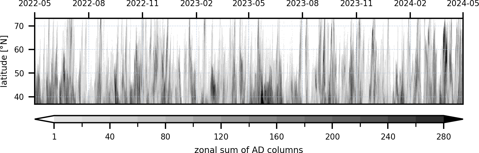 A more detailed insight in the AD extent can be achieved when looking at the temporal evolution of the extent of the ADs (see Fig. 2), which shows a time series of the AD extent. Long, vertical stripes depict ADs that reach far north, while darker colours depict ADs that cover a wide longitudinal band. While this figure does not allow a detailed analysis of the AD extent, it does show that it is rare that no AD-air is present in the domain north of 37° N. In fact, in only 2.7 % of the hours during the analysed 2-year period, does AD-air cover less than 1 % of the columns in the domain. Many times during these 2 years, ADs do reach as far north as Scandinavia. There are very different flavours of events, i.e. different combinations of extent towards the north, width (intensity of the colour in Fig. 2), and duration. This also becomes apparent, when additionally looking at the number of trajectories in the domain (not shown here) and not only the number of identified AD-columns. A large spatial extent can occur both with a high and low trajectory density. The same is valid for ADs with a smaller spatial extent.