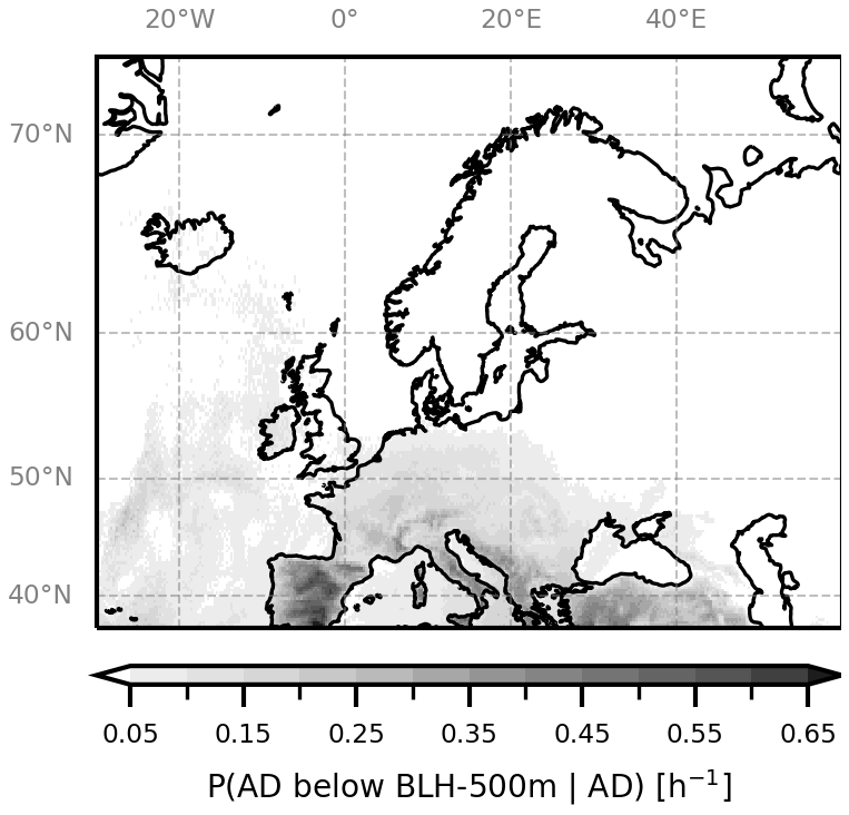 It is important not only to assess whether the AD forms a lid, but also to determine whether it enters the boundary layer (BL) at all. An AD-cell is identified as within the BL, when its centre is below BLH – 500 m (to match the definition of the lid, also daytime hours only). The probability of an AD-cell within the BL given that an AD is present is shown in Fig. 7. AD-air penetrates the local BL in less than 20 % of the time in most of the domain. This is expected, as AD-air is expected to have higher potential temperature than the local BL, simply due to its origin in a low-latitude and desert region. However, over the Iberian highlands this probability is greatly increased, to more than 60 % of the daytime hours with AD presence. Similar behaviour is seen in the Pyrenees, Alps, Apennines, and Dinaric Alps – hence, in mountainous regions. This is due to the fact that in these regions, simply due to orography, the BLH is already higher above sea level than in other regions. With enough solar heating its properties can become similar to those of the arriving AD-air, which facilitates the intrusion of the latter into the BL. This is supported by the seasonal analysis (Fig. A3, in the Appendix). Another reason for this behaviours could be overestimated BLHs in ERA5. Also, in inhomogeneous, mountainous terrain, mesoscale processes can influence the vertical exchange processes, and therefore the BLH (Rotach et al., 2015), so it can be very difficult to evaluate the BLH in numerical models (Rotach et al., 2017). ERA5 BLH has been found to be well correlated with radiosonde products by Guo et al. (2021), it represents BLHs over Europe well, with an average bias of 50 m. Other studies found ERA5 overestimates BLH especially during daytime in summer over complex terrain (up to 800 or 2000 m Madonna et al., 2021; Wei et al., 2025, respectively).