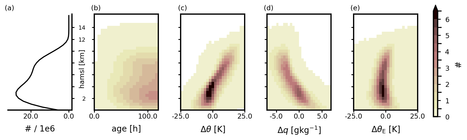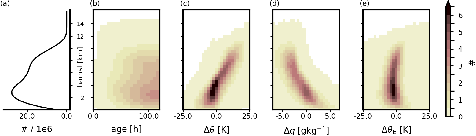 Figure 82D-histograms of cell-averaged changes in trajectories. For each AD-cell (0.25° × 0.25° × 500 m) all trajectories within are averaged. The histograms depict the distribution of cells in total (a), the average age (b), average differences to the starting location of potential temperature (Δθ, c), specific humidity (Δq, d), and equivalent potential temperature (ΔθE, e), respectively, across all cells north of 37° N and all time steps.