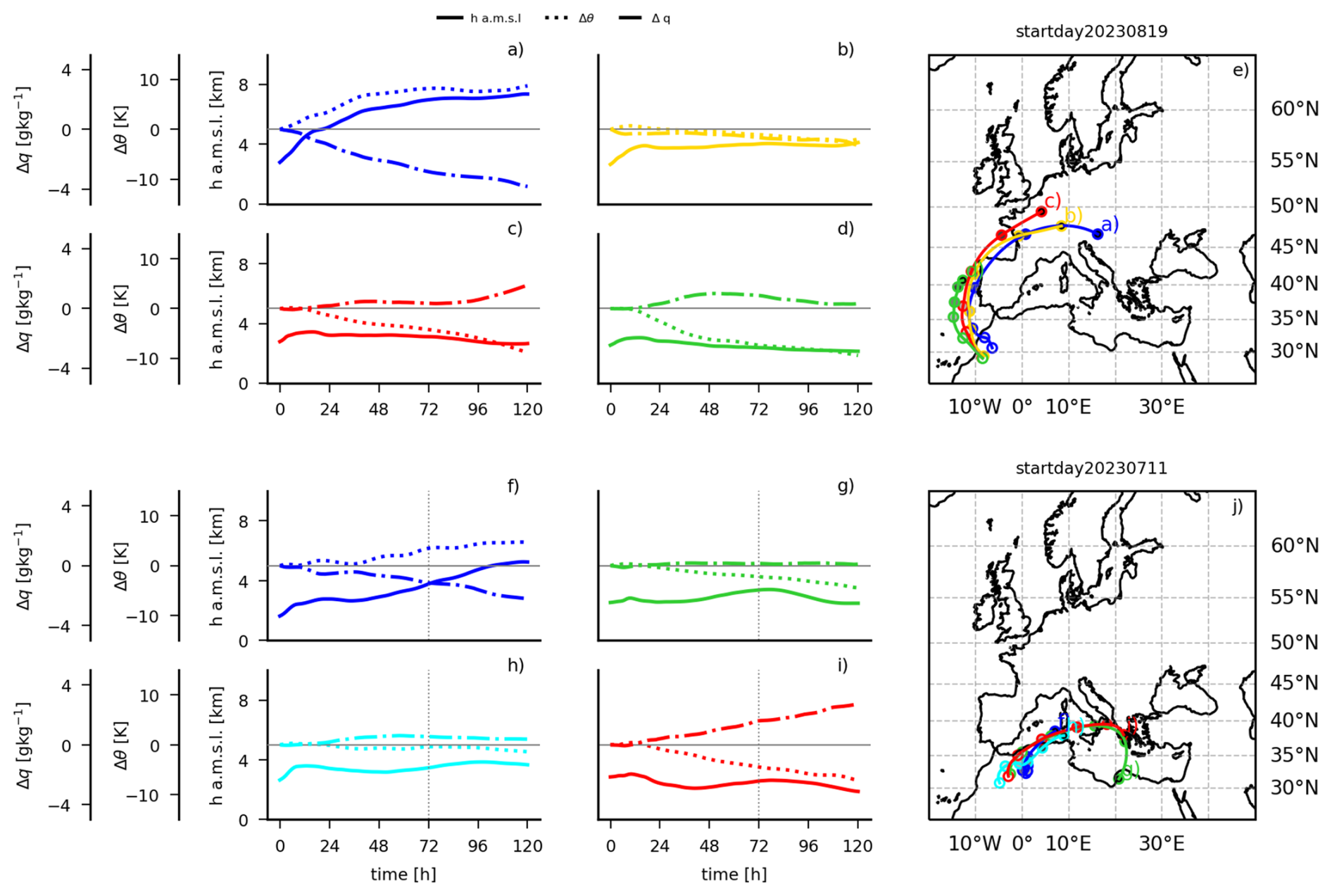 Figure 9Exemplary display of the trajectory clusters for the trajectories initialised on 19 August 2023 (top) and 11 July 2023 (bottom). The AD maximum is at 24 August 2023, 11:00 UTC (5 d after initialisation), and 14 July 2023, 06:00 UTC (3 d after initialisation), respectively. Note that 120 and 72 h (marked with vertical line in panels f–i) indicate the approximate time around which the AD maximum occurs, respectively. Since the trajectories averaged in the cluster means have varying initialisation times, this time point does not correspond to the exact time for all individual trajectories. Panels (a)–(d) and (f)–(i) depict the temporal evolution of the individual cluster means. Lines depict h a.m.s.l. (solid), Δθ (dotted), and Δq (dash-dotted) with respect to initialisation. Panels (e) and (j) show the paths of the cluster means.