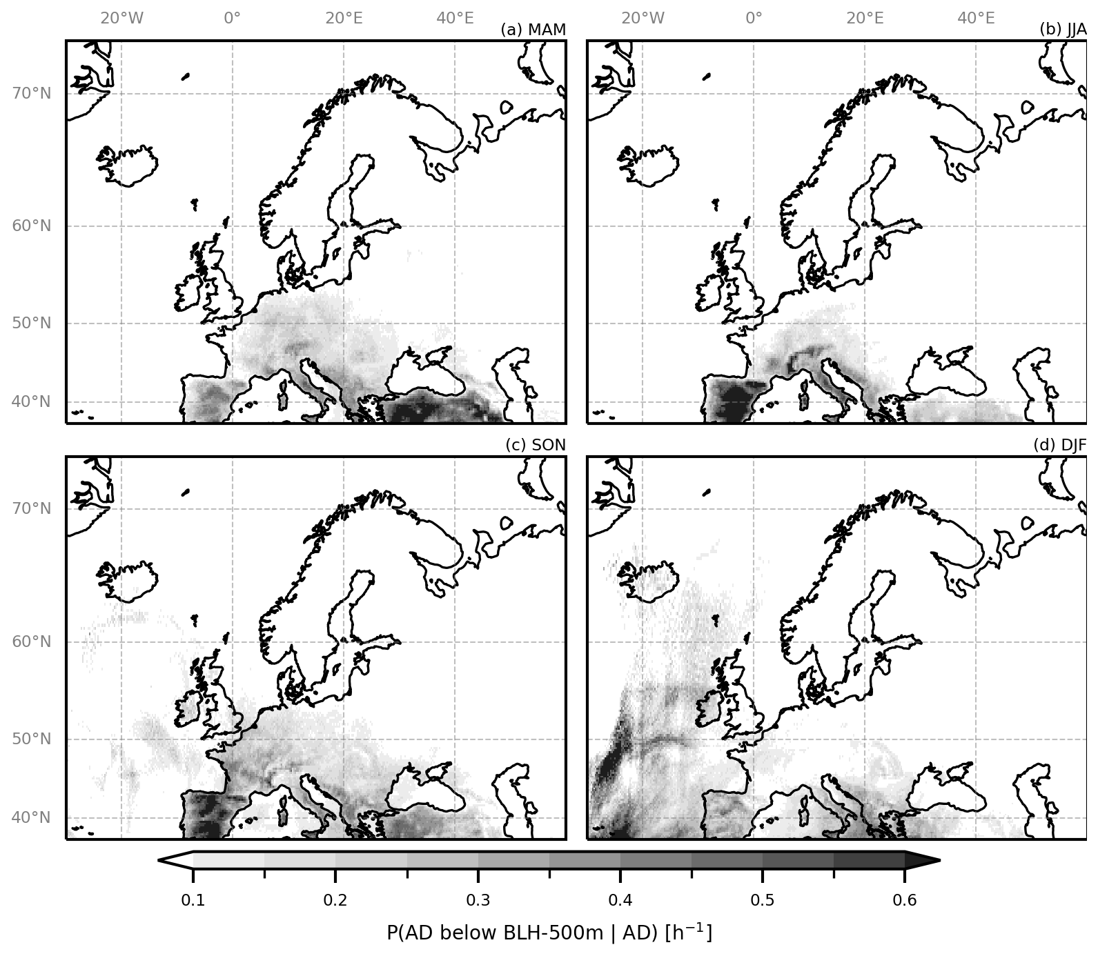 The highest probabilities for an AD to enter the local BLH are found over mountainous areas, in particular during he warmer seasons, when the local BL is additionally heated. Especially high values are found in JJA and SON over the high regions on the Iberian Peninsula, the Alps, the Apennines, and the Dinaric Alps. In these seasons also the larger Mediterranean islands experience higher probabilities. The south-eastern Mediterranean region has elevated values in MAM already, possibly indicating warm, deep BLH earlier in the year in this region. In autumn, the eastern Mediterranean sea has elevated probabilities, likely because in this season the sea is still warm compared to the surrounding land masses.