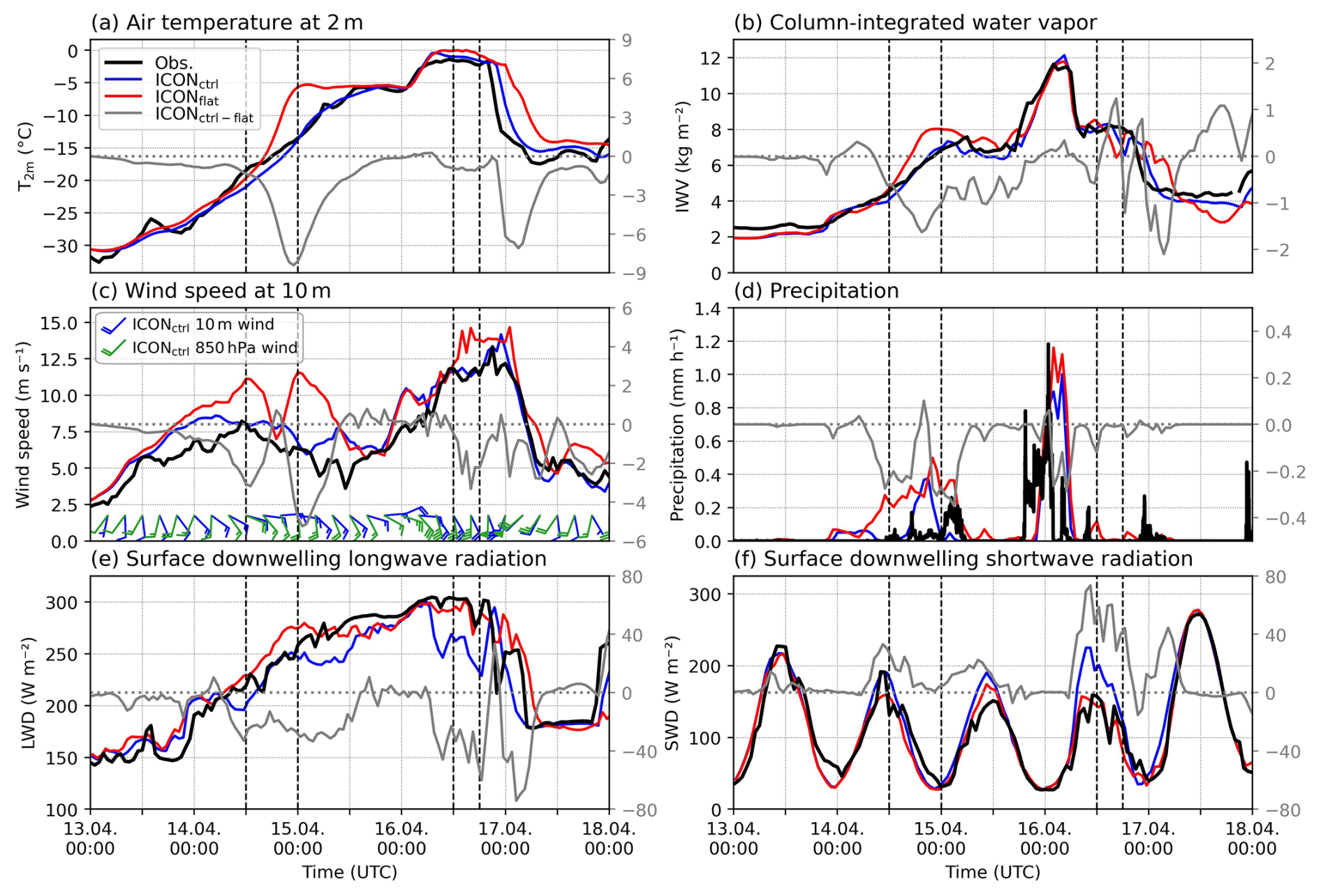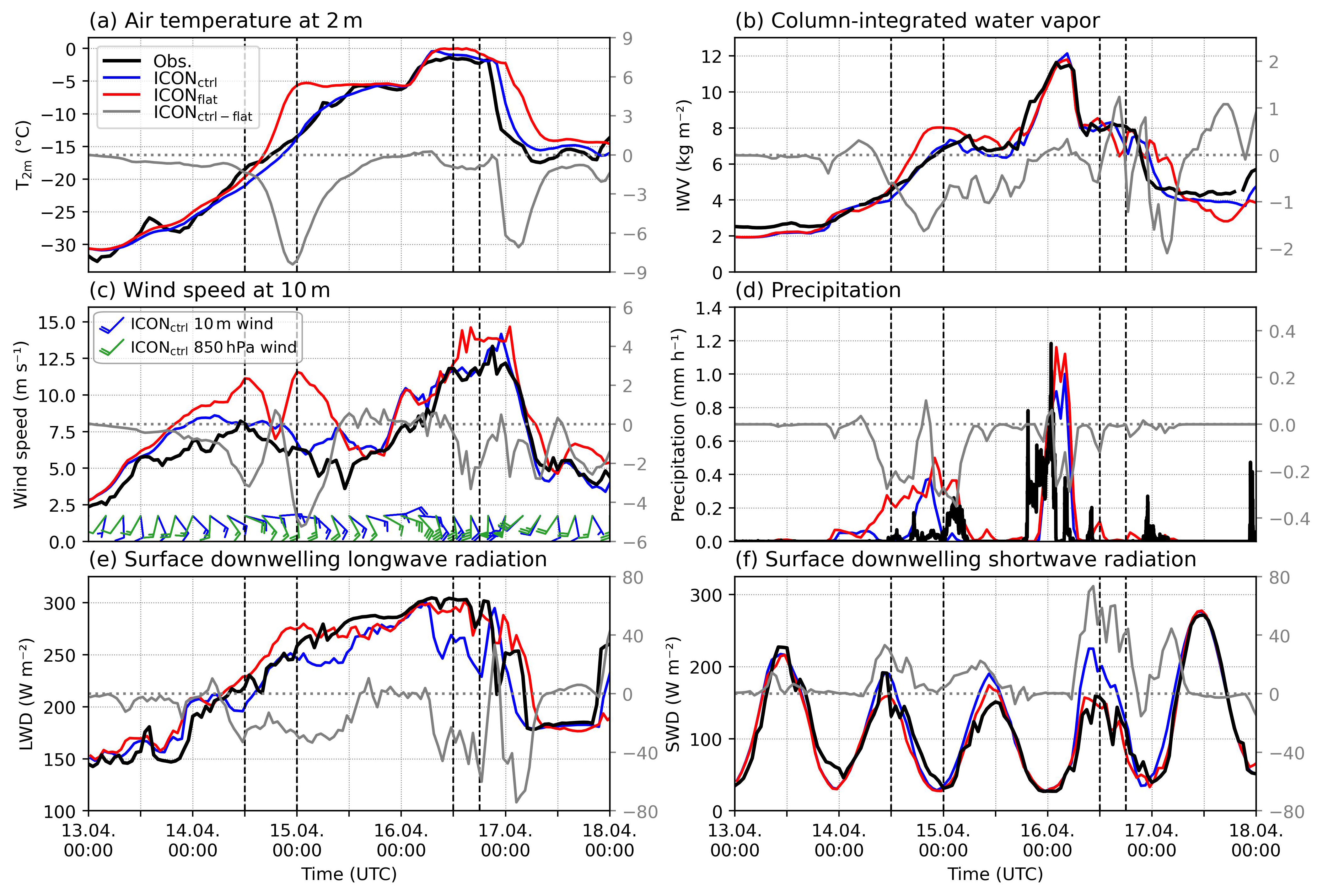Figure 2Meteorological conditions at the MOSAiC site during 13–17 April 2020, based on observations and two ICON simulations. Observational data are hourly mean data from the MOSAiC meteorological tower (Cox et al., 2023), except precipitation (KAZR radar 170 m a.g.l. snowfall rate, Matrosov et al., 2022). Differences between 𝙸𝙲𝙾𝙽𝚌𝚝𝚛𝚕 and 𝙸𝙲𝙾𝙽𝚏𝚕𝚊𝚝 are shown in gray (right hand y axes). The vertical dashed lines mark the two selected time periods, 14 April 12:00–24:00 UTC and 16 April 12:00–18:00 UTC, during which the air masses arriving at the MOSAiC site had previously crossed high terrain and undergone subsidence (see Sect. 3.1.1).