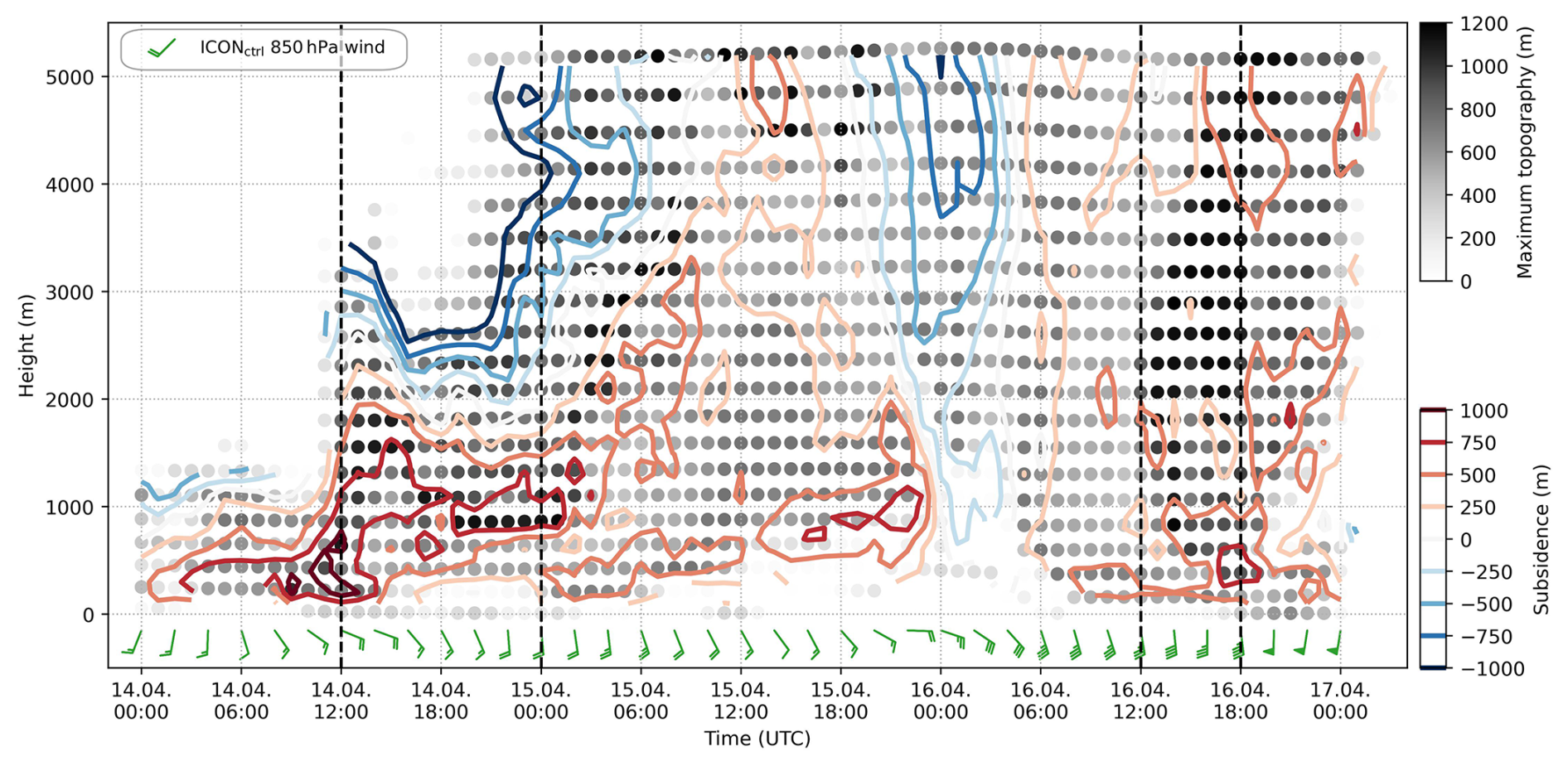 Figure 3Maximum topography and subsidence for trajectories arriving at the MOSAiC site during 14–16 April 2020. The values are averages over trajectories, traced up to 36 h backward in time, that were initialized at the same time and height level. Blank areas indicate initialization times and heights where none of the trajectories passed over Svalbard. Contour lines indicate the vertical height difference between the maximum altitude over land (Svalbard) and the arrival height at the MOSAiC site. Red (blue) contours represent descending (ascending) air parcels relative to their peak height over land. The vertical dashed lines mark the two selected time periods, 14 April 12:00–24:00 UTC and 16 April 12:00–18:00 UTC.