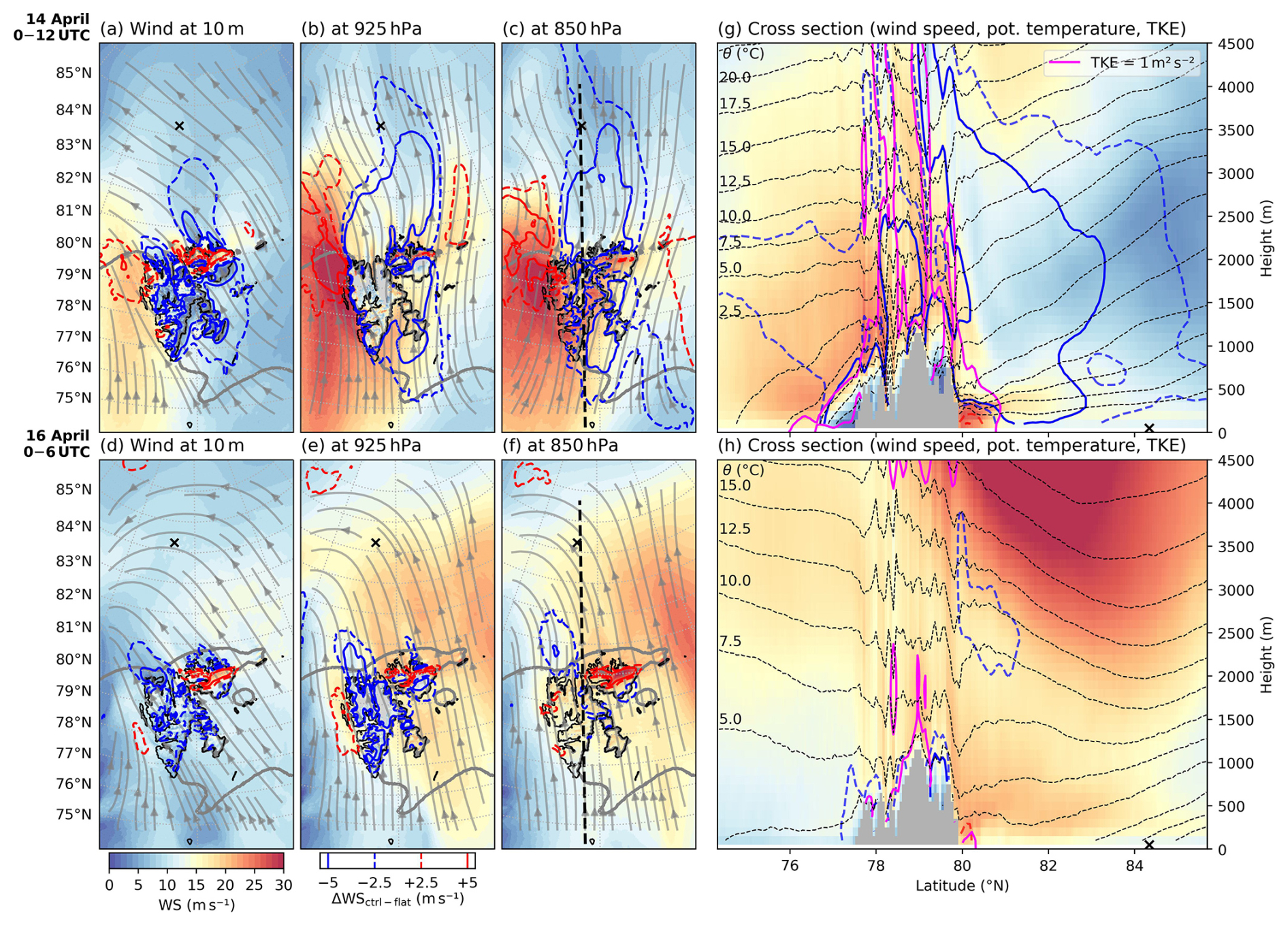 Figure 4Wind speed and direction in 𝙸𝙲𝙾𝙽𝚌𝚝𝚛𝚕 averaged over 14 April 2020 00:00–12:00 UTC (a–c, g) and 16 April 2020 00:00–06:00 UTC (d–f, h). The maps show wind speed (WS, shading) and horizontal flow (streamlines) at 10 m, 925 and 850 hPa height. Blue and red contours in all panels indicate the wind speed difference ΔWSctrl−flat (i.e., 𝙸𝙲𝙾𝙽𝚌𝚝𝚛𝚕 minus 𝙸𝙲𝙾𝙽𝚏𝚕𝚊𝚝). Blue (red) contours indicate a decrease (increase) in wind speed due to Svalbard's topography. For visual clarity, a light Gaussian filter (σ = 0.8) was applied to smooth small-scale features in the contours. The black cross marks the position of MOSAiC. The thick gray contour outlines the 70 % sea ice fraction. The cross-sections (g, h) along the dashed black line in panels (c) and (f) show the wind speed on the same color scale as well as potential temperature θ (dashed black contours) and turbulent kinetic energy (TKE, pink contour).