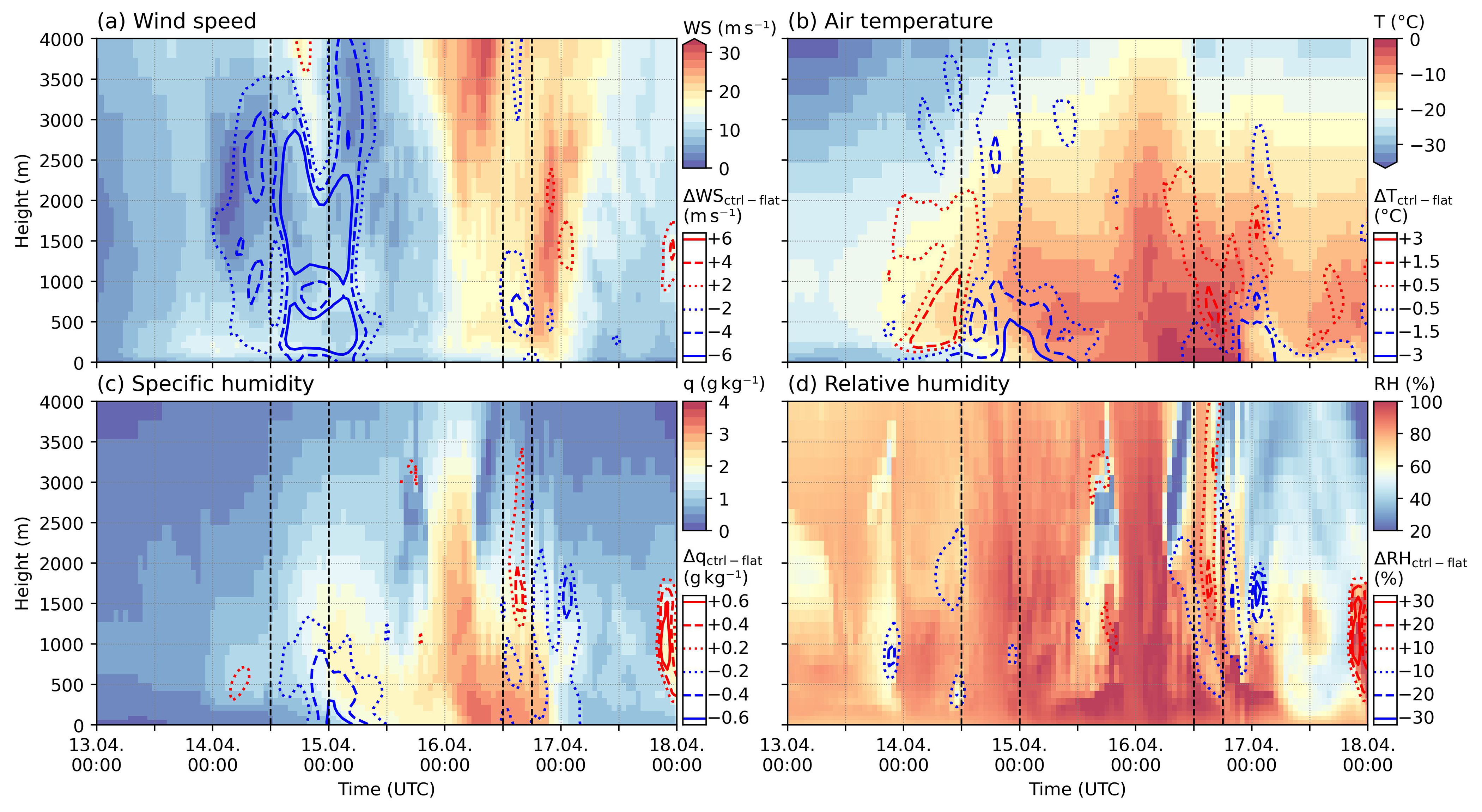 Figure 6Vertical profiles of wind speed (a), air temperature (b), specific humidity (c) and relative humidity (d) at the MOSAiC site during 13–17 April 2020 in 𝙸𝙲𝙾𝙽𝚌𝚝𝚛𝚕 (shading). Contour lines indicate differences 𝙸𝙲𝙾𝙽𝚌𝚝𝚛𝚕 minus 𝙸𝙲𝙾𝙽𝚏𝚕𝚊𝚝, smoothed with a Gaussian filter (as in Fig. 4). The vertical dashed lines mark two selected time periods, as explained in Fig. 2.