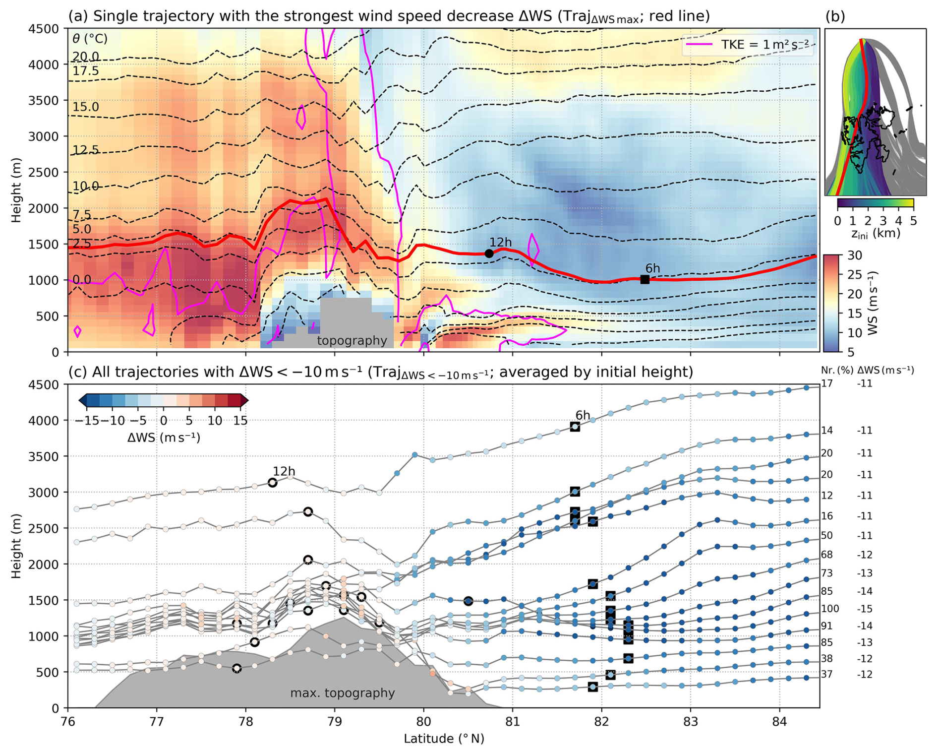 Figure 7Air mass trajectories arriving at the MOSAiC site on 14 April 2020 21:00–23:00 UTC. ΔWS denotes the wind speed change along trajectories relative to 76–77° N. Red lines in panels (a)–(b) highlight the trajectory with the largest ΔWS at the MOSAiC site. Panel (a) shows its vertical profiles of WS (shading), potential temperature θ (dashed black contours) and turbulent kinetic energy (pink contour). In panel (b), all trajectories with ΔWS < −10 m s−1 at the MOSAiC site are color-highlighted. Panel (c) shows their mean height (gray lines) and ΔWS (dot color), averaged in latitudinal bins for trajectories initialized at the same height. The text on the right side indicates the number fraction of this subset of trajectories as well as their averaged ΔWS at the MOSAiC site. The maximum topography along the trajectories is indicated in gray. Black squares (circles) indicate air parcel positions 6 (12) h back in time from initialization.