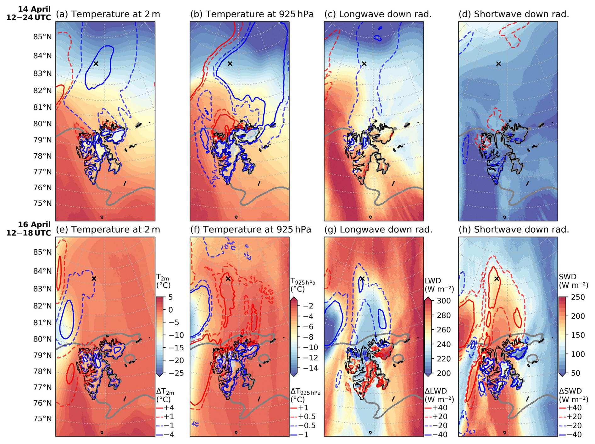 Figure 8Air temperature at 2 m (a, e), air temperature at 925 hPa (b, f), and surface downwelling longwave (c, g) and shortwave radiation (d, h) in 𝙸𝙲𝙾𝙽𝚌𝚝𝚛𝚕 averaged over 14 April 2020 12:00–24:00 UTC (a–d) and 16 April 2020 12:00–18:00 UTC (e–h). Contours indicate the difference 𝙸𝙲𝙾𝙽𝚌𝚝𝚛𝚕 minus 𝙸𝙲𝙾𝙽𝚏𝚕𝚊𝚝, smoothed with a Gaussian filter (as in Fig. 4). The black cross marks the position of MOSAiC. The thick gray contour outlines the 70 % sea ice fraction.