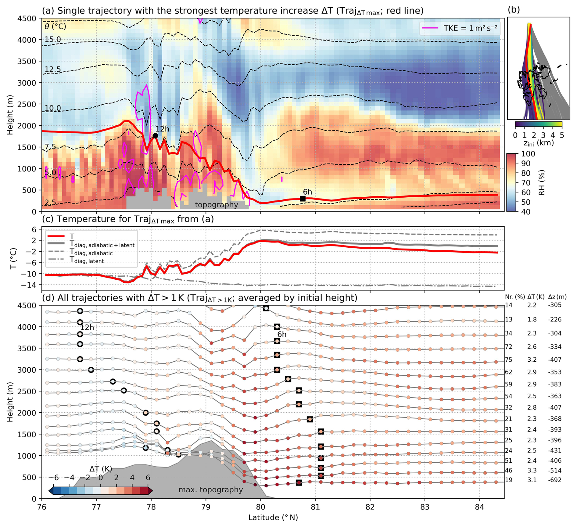 Figure 9Air mass trajectories arriving at the MOSAiC site on 16 April 2020 15:00–17:00 UTC. ΔT denotes the temperature change along trajectories relative to 76–77° N. Red lines in panels (a)–(c) highlight the trajectory Traj with the largest ΔT at the MOSAiC site. Panel (a) shows its vertical profiles of relative humidity (shading) and potential temperature θ (dashed black contours). Panel (c) shows the corresponding air parcel temperature simulated by 𝙸𝙲𝙾𝙽𝚌𝚝𝚛𝚕, along with temperatures diagnosed from adiabatic and latent heat contributions. In panel (b), all trajectories with ΔT > 1 K at the MOSAiC site are color-highlighted. Panel (d) shows their height (gray lines) and ΔT (dot color), averaged in latitudinal bins for trajectories initialized at the same height. The text on the right side indicates the number fraction of this subset of trajectories, as well as their averaged ΔT and height change Δz at the MOSAiC site. The maximum topography along the trajectories is indicated in gray. Black squares (circles) indicate air parcel positions 6 (12) h back in time from initialization.