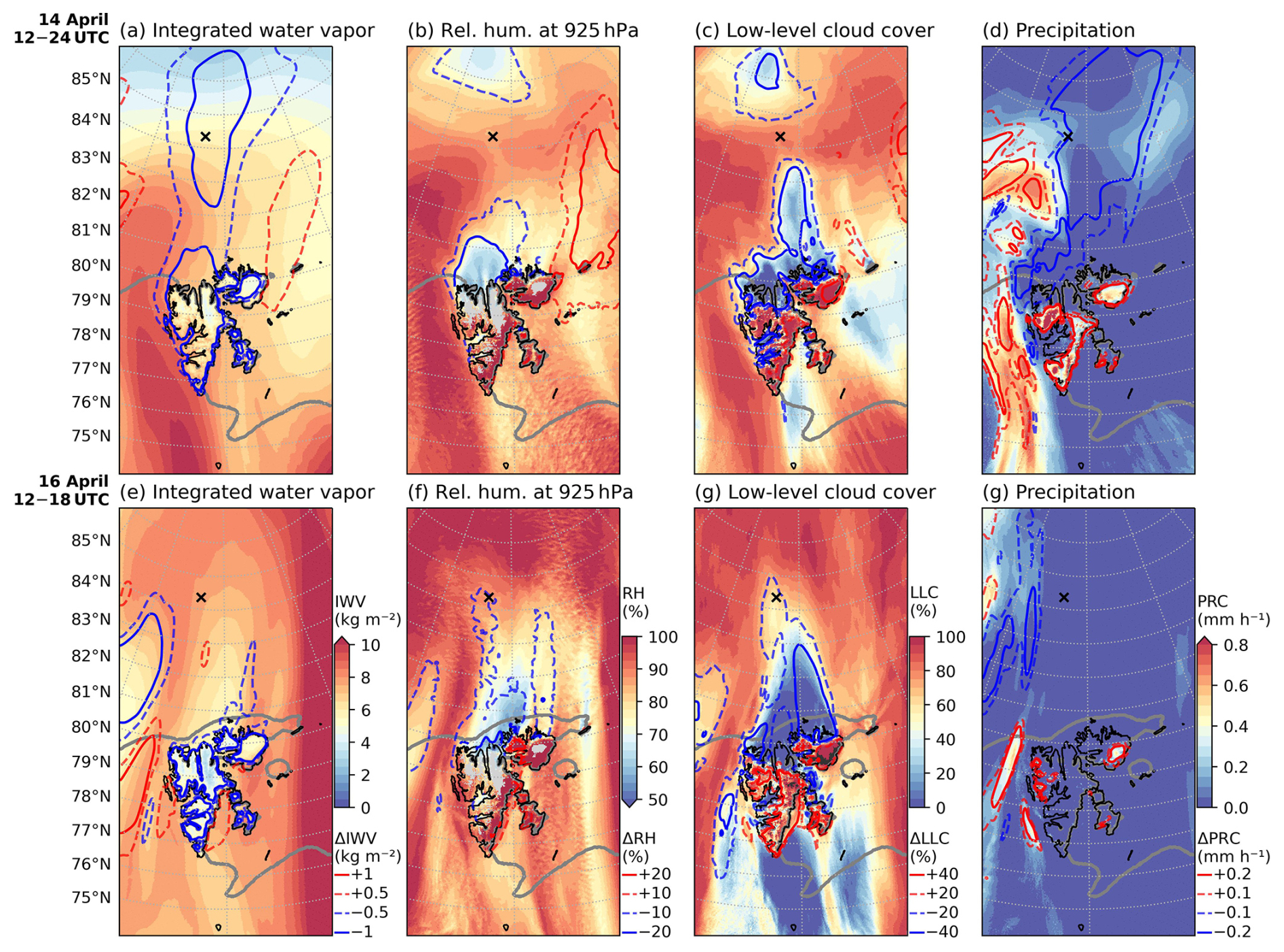 Figure 10Column-integrated water vapor (a, e), relative humidity at 925 hPa height (b, f), low-level (> 800 hPa) cloud cover (c, g) and total precipitation (d, h) in 𝙸𝙲𝙾𝙽𝚌𝚝𝚛𝚕 averaged over 14 April 2020 12:00–24:00 UTC (a–d) and 16 April 2020 12:00–18:00 UTC (e–h). Contours indicate the difference 𝙸𝙲𝙾𝙽𝚌𝚝𝚛𝚕 minus 𝙸𝙲𝙾𝙽𝚏𝚕𝚊𝚝, smoothed with a Gaussian filter (as in Fig. 4). The black cross marks the position of MOSAiC. The thick gray contour outlines the 70 % sea ice fraction.