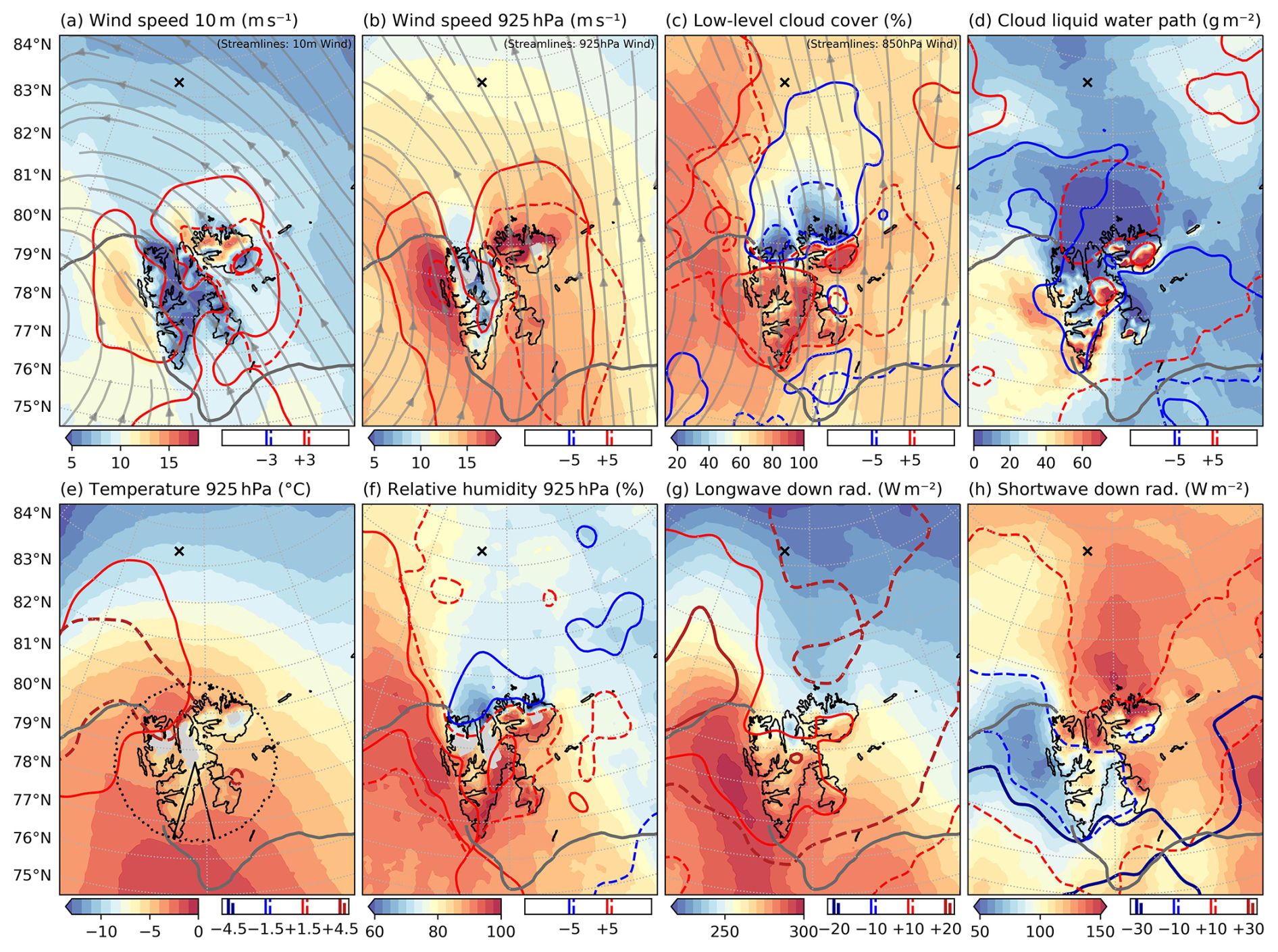 Föhn effects are most evident in terms of reduced relative humidity, low-level cloud cover and cloud liquid water path north of Svalbard compared to the flow around the archipelago, where they are actually increased by the influence of Svalbard (Fig. 11c, d, f). These effects are visible up to 83–84° N, showing that Svalbard’s topography can influence the atmosphere several hundred kilometers to the north during strong poleward advection events. At higher wind speeds relative humidity decreases north of Svalbard, and low-level cloud cover decreases by more than 5 % up to 84° N (Fig. 11c, solid blue contour). In this Eulerian analysis, the geographical extent of topographic effects is determined by how long the persistent southerly advection over Svalbard lasts, and therefore how far the air can travel within that time with a given wind speed. The Lagrangian analyses in Sect. 3.1 show that air masses need ∼ 12 h to travel over Svalbard to > 84° N, and some remote effects are likely missed in the Eulerian approach. For high vs. low IVTSv, the low-level cloud cover is further reduced up to ∼ 82° N (Fig. 11c, dashed blue contour) due to stronger föhn, but this effect does not extend as far north as for high vs. low WS850 hPa,Sv. This is probably because more moisture is available in the high IVTSv cases overall, which increases relative humidity and cloudiness (Fig. 11c, d, f), offsetting drying locally induced by the topography.