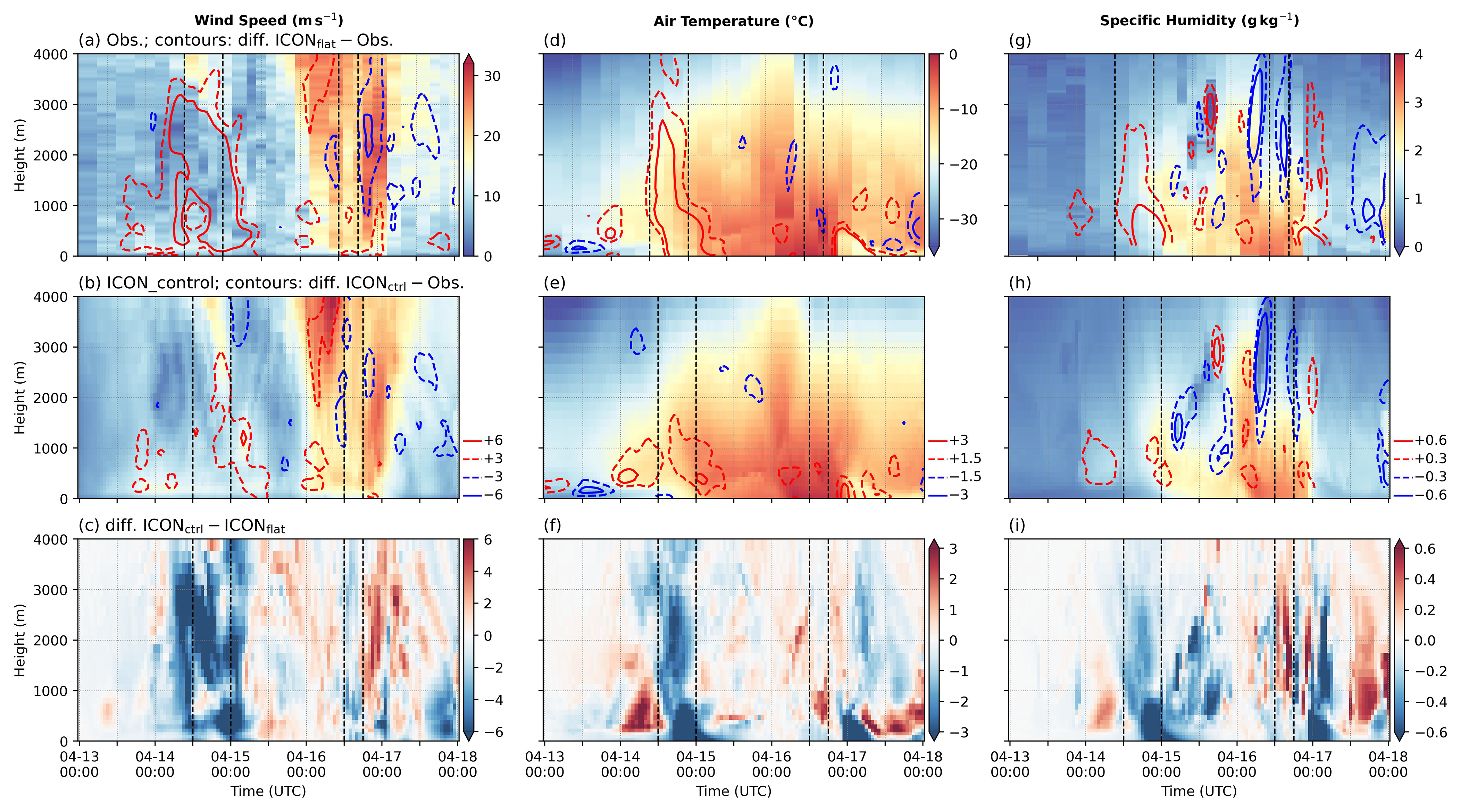 Figure A1Vertical profiles of wind speed (a–c), air temperature (d–e) and specific humidity (g–i) at the MOSAiC site during 13–17 April 2020. The background shading show MOSAiC radiosonde observations (𝙾𝚋𝚜) from Dahlke et al. (2023) (a, d, g), output from 𝙸𝙲𝙾𝙽𝚌𝚝𝚛𝚕 (b, e, h) and the difference 𝙸𝙲𝙾𝙽𝚌𝚝𝚛𝚕−𝚏𝚕𝚊𝚝 (c, f, g). Contour lines indicate differences 𝙸𝙲𝙾𝙽𝚏𝚕𝚊𝚝−𝙾𝚋𝚜 (a, d, g) and 𝙸𝙲𝙾𝙽𝚌𝚝𝚛𝚕−𝙾𝚋𝚜 (b, e, h), smoothed with a Gaussian filter (as in Fig. 4). The vertical dashed lines mark two selected time periods, as explained in Fig. 2.