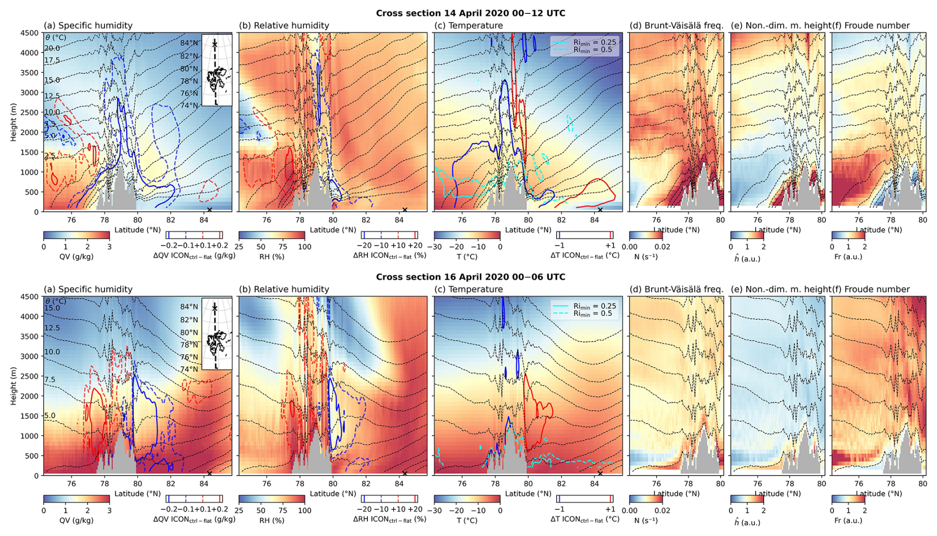 Figure A2Cross section across Svalbard to MOSAiC (dashed black line in inset map) during 14 April 2020 00:00–12:00 UTC (top) and 16 April 2020 00:00–06:00 UTC (bottom). Shown are time averages of the specific humidity (a), relative humidity (b), air temperature (c), Brunt–Väisälä frequency (d), non-dimensional mountain height (e), Froude number (f). Blue and red contours in all panels indicate the difference 𝙸𝙲𝙾𝙽𝚌𝚝𝚛𝚕−𝚏𝚕𝚊𝚝 of the respective quantity, smoothed with a Gaussian filter (as in Fig. 4). Additionally shown are the potential temperature θ (dashed black contours) and time minimum values of the Richardson number (light blue contours in panel c).