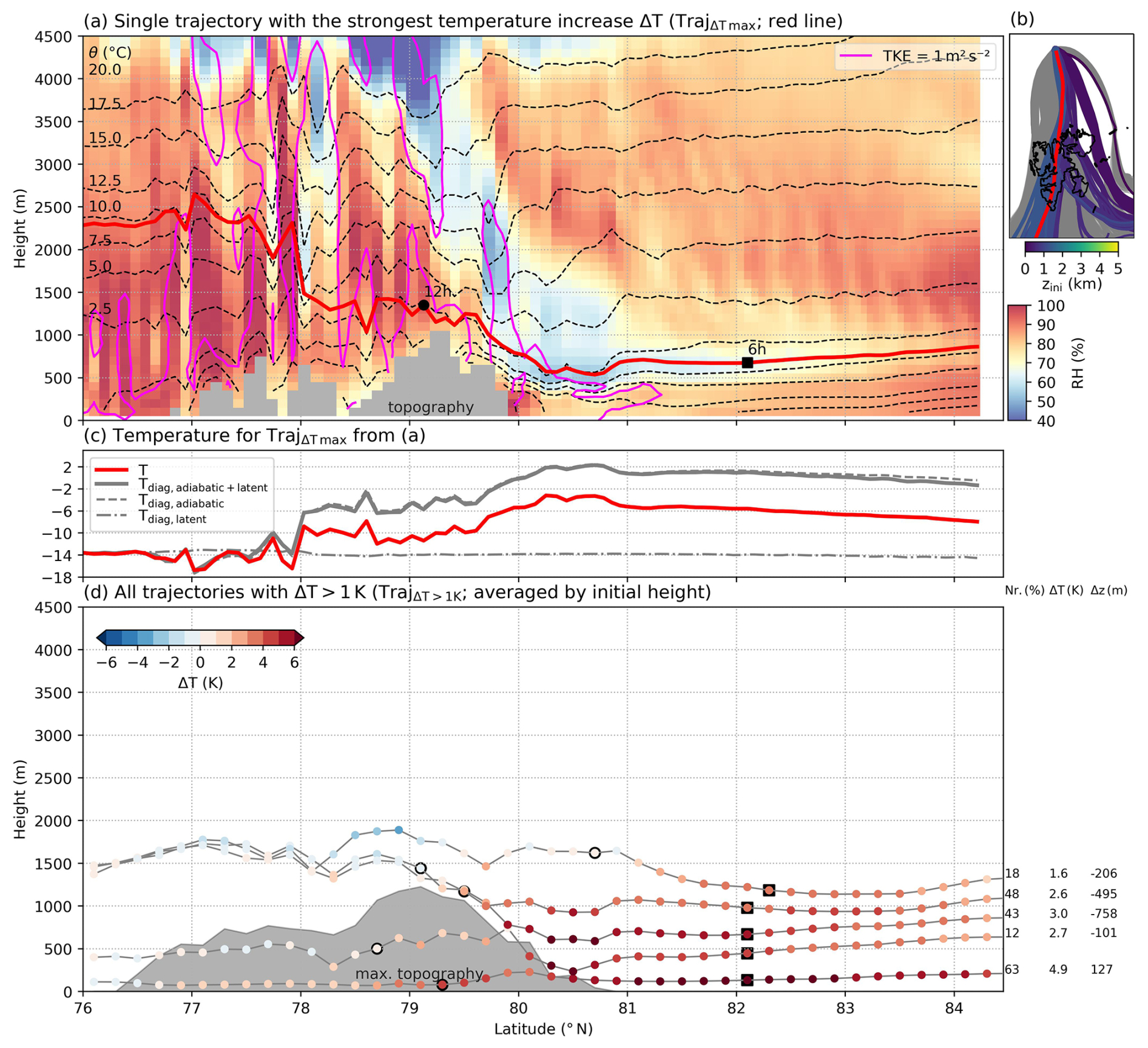 As discussed, Svalbard's topography causes reduced downstream air temperatures especially around 14–15 April and to a lesser degree on 16 April near the surface. On the other hand, also föhn warming effects are noticeable on the lee side of Svalbard on 14 April 12:00–24:00 UTC (Fig. 8a–b). On 16 April, these warming effects stand out more clearly north of Svalbard and up to MOSAiC. In the Eulerian view this is apparent as a ca. +1.5 K air temperature difference in 𝙸𝙲𝙾𝙽𝚌𝚝𝚛𝚕 vs. 𝙸𝙲𝙾𝙽𝚏𝚕𝚊𝚝 at ∼ 300–1200 m and 925 hPa height (Figs. 6b, 8f, A4c). However, the Lagrangian perspective on the air parcel trajectories in Fig. 9 provides the clearest picture of föhn effects. All trajectories arriving at the MOSAiC site on 16 April 15:00–17:00 UTC travel from the south over some part of the archipelago (Fig. 9b). A large subset TrajΔT>1 K of them shows a warming ΔT > 1 K between the windward side of Svalbard (76–77° N) and the MOSAiC site. These air parcels passed over Spitsbergen, about 12 h before reaching MOSAiC in the case of trajectories below ∼ 2500 m (Fig. 9d). They then experience a drawdown on the order of 500 m, mostly between 79 and 80° N, as indicated by the median height of the selected trajectories (gray lines) and by the isentropes (dotted black lines) along the trajectory Traj with the largest ΔT (red line; Fig. 9a–c). This results in a mean warming of up to 6 K, which is largest around 80° N at ∼ 300 m for the trajectories intitialized at 383 m height (Fig. 9d). Subsequently, the trajectories slightly ascend and cool again but still carry the elevated temperatures partly up to the MOSAiC site. There, the lower-level föhn warming is most evident at 605 and 835 m height, where ΔT exceeds +1 K for half of the trajectories and the mean warming is 3.3 and 2.4 K, respectively. This shows that the positive temperature differences found in 𝙸𝙲𝙾𝙽𝚌𝚝𝚛𝚕 vs. 𝙸𝙲𝙾𝙽𝚏𝚕𝚊𝚝 at this height (Figs. 6b, 8f, A4c) result from föhn effects induced by Svalbard's topography.