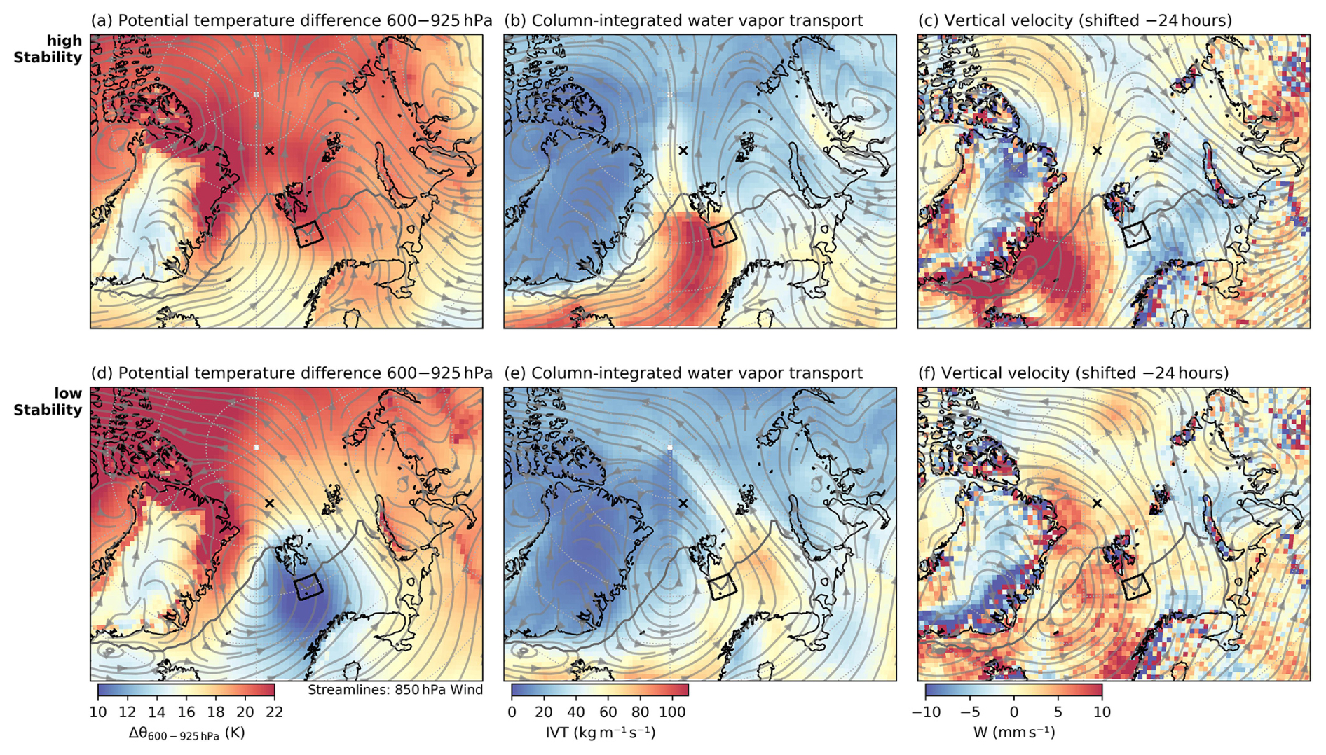 Figure A6Climatological composites of meteorological conditions around Svalbard for high (a–c) and low (d–f) stability of the impinging southerly flow during March–April–May 2000–2022 in 𝙸𝙲𝙾𝙽𝚌𝚕𝚒𝚖 (compare Fig. 12). Shown are the stability index Δθ600−925 hPa (a, d), column-integrated water vapor transport (b, e) and the vertical velocity 24 h earlier (c, f). The black cross marks the position of MOSAiC. The thick gray contour outlines the 70 % sea ice fraction.